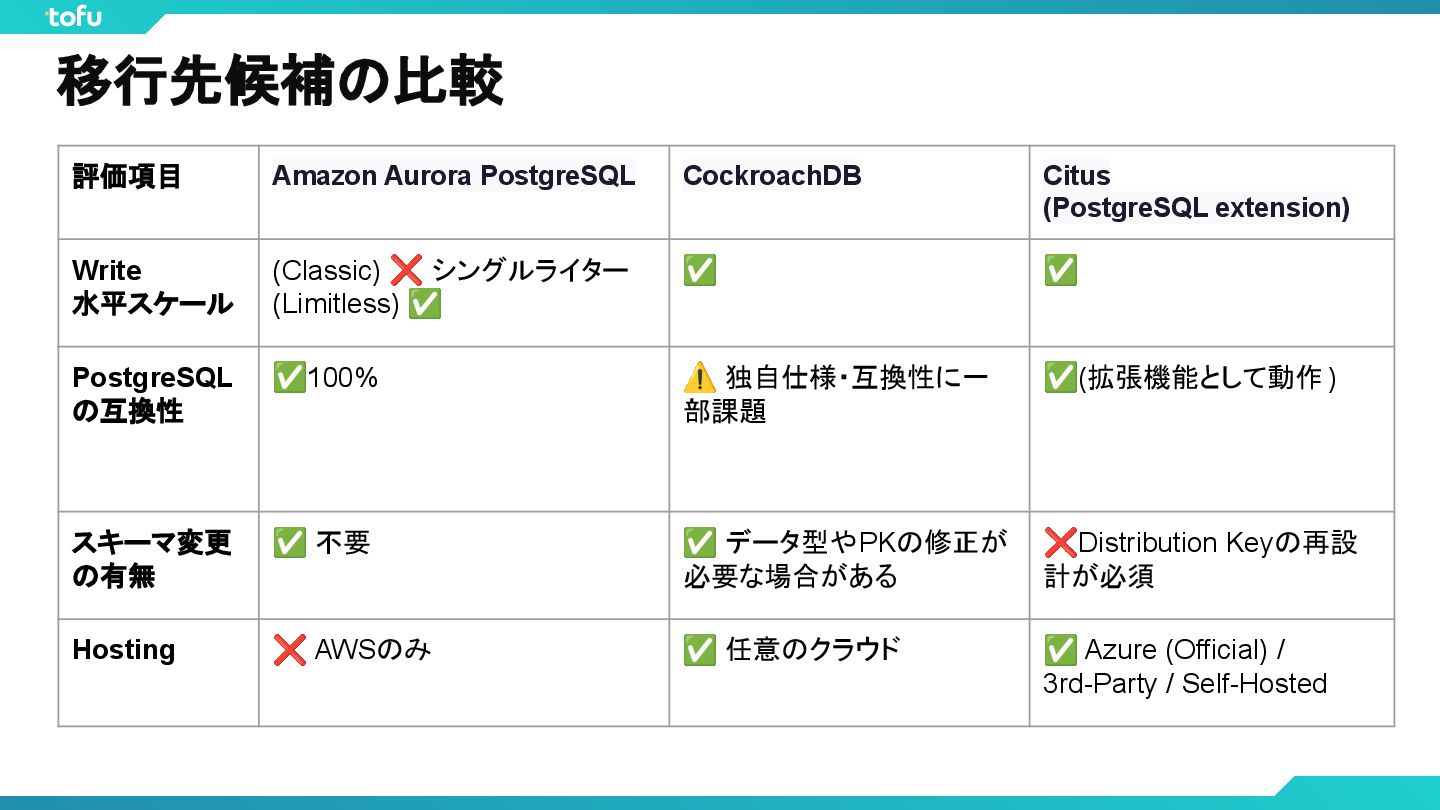 Read/Write両 方の処理能力をシステムを止めることなく線 形に拡張可能。 PostgreSQLの互 換性 ✅ PostgreSQLのクエリ層をそのまま利用し ているため、独自の構文は不要。既存の ORM、ドライバ、運用ツールがそのまま動く スキーマ変更の有 無 ✅ ほぼ不要・そのまま移行可能 Hosting 任意のクラウドを選択することができる 将来的にAnywhereやOpen Sourceのオプ ションもあり Raft 合意