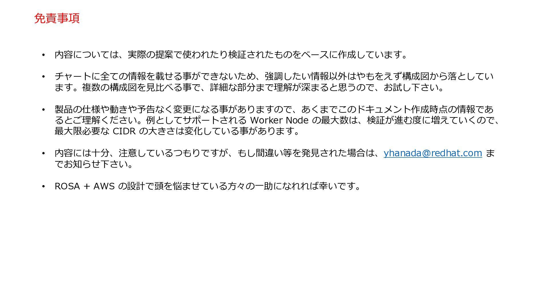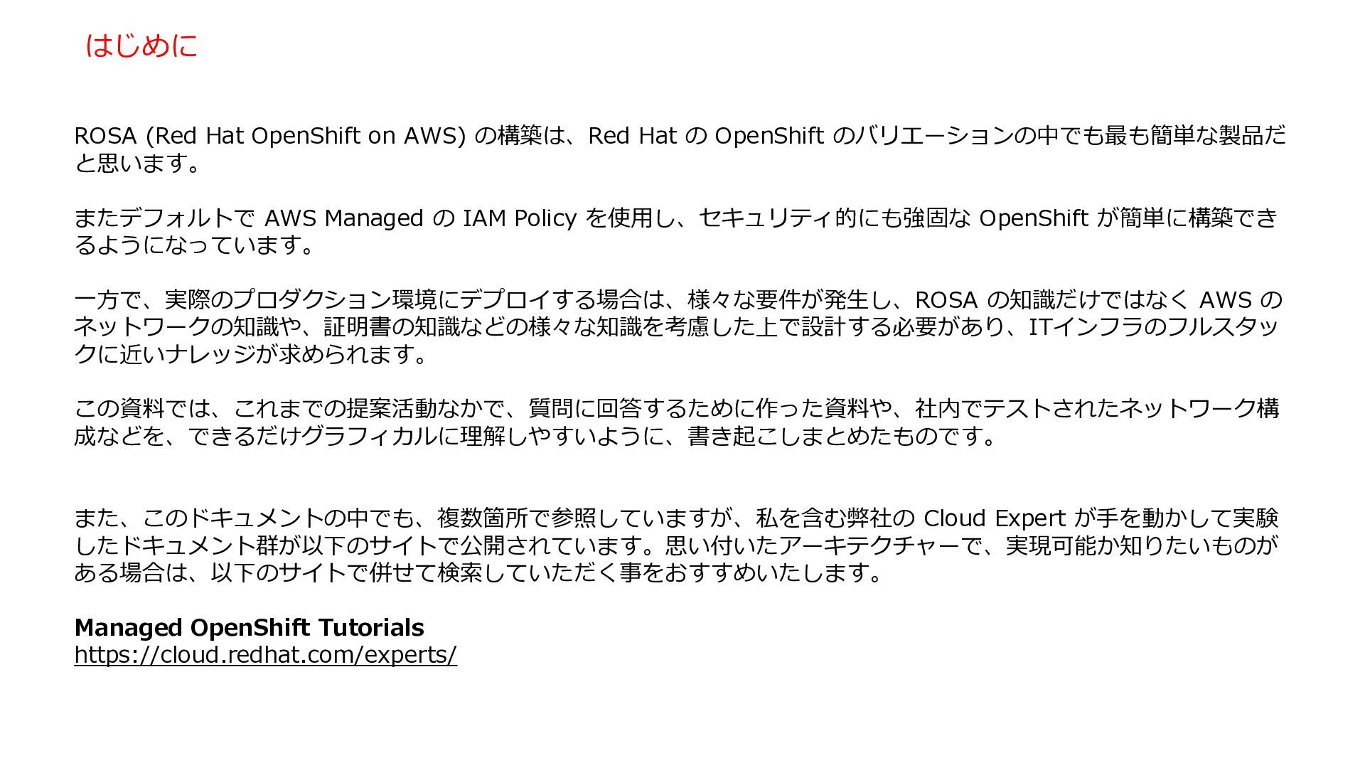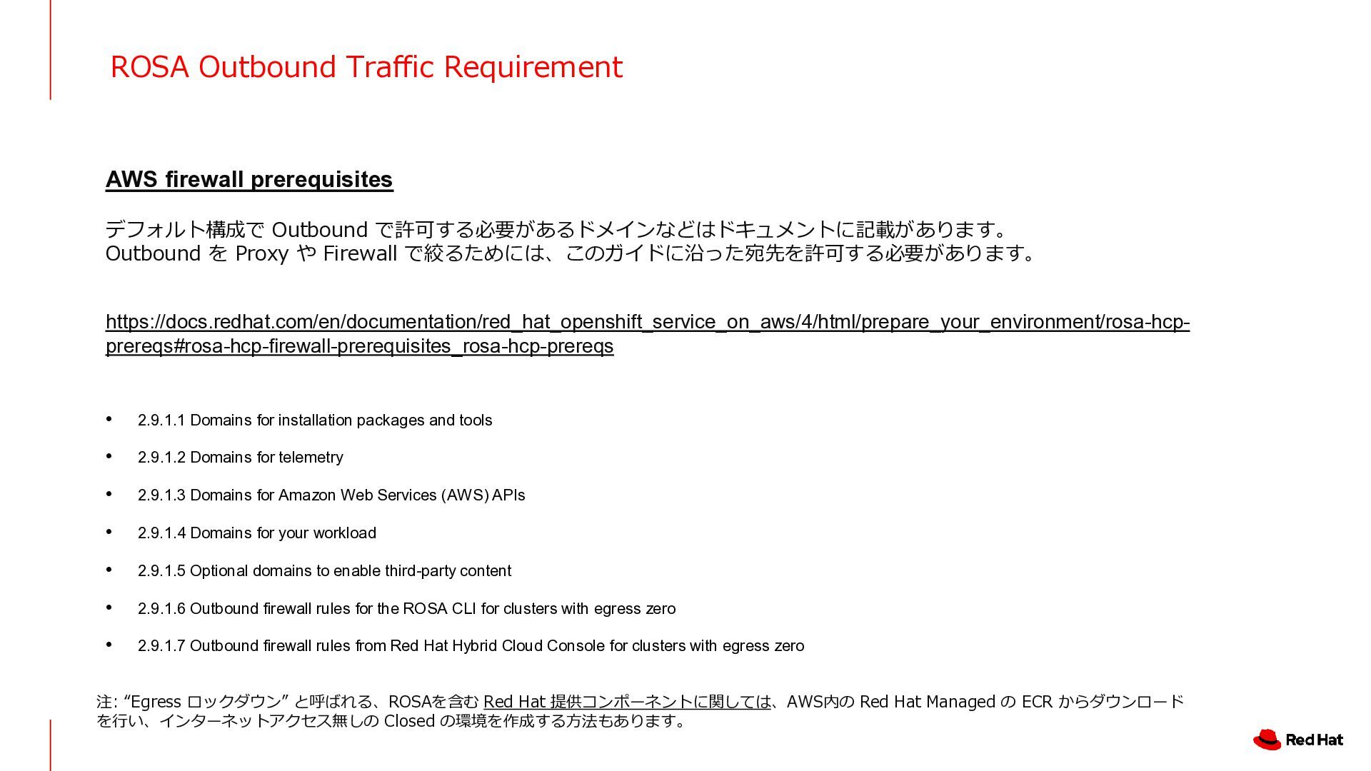Outbound を Proxy や Firewall で絞るためには、このガイドに沿った宛先を許可する必要があります。 https://docs.redhat.com/en/documentation/red_hat_openshift_service_on_aws/4/html/prepare_your_environment/rosa-hcp- prereqs#rosa-hcp-firewall-prerequisites_rosa-hcp-prereqs • 2.9.1.1 Domains for installation packages and tools • 2.9.1.2 Domains for telemetry • 2.9.1.3 Domains for Amazon Web Services (AWS) APIs • 2.9.1.4 Domains for your workload • 2.9.1.5 Optional domains to enable third-party content • 2.9.1.6 Outbound firewall rules for the ROSA CLI for clusters with egress zero • 2.9.1.7 Outbound firewall rules from Red Hat Hybrid Cloud Console for clusters with egress zero 注: “Egress ロックダウン” と呼ばれる、ROSAを含む Red Hat 提供コンポーネントに関しては、AWS内の Red Hat Managed の ECR からダウンロード を行い、インターネットアクセス無しの Closed の環境を作成する方法もあります。
