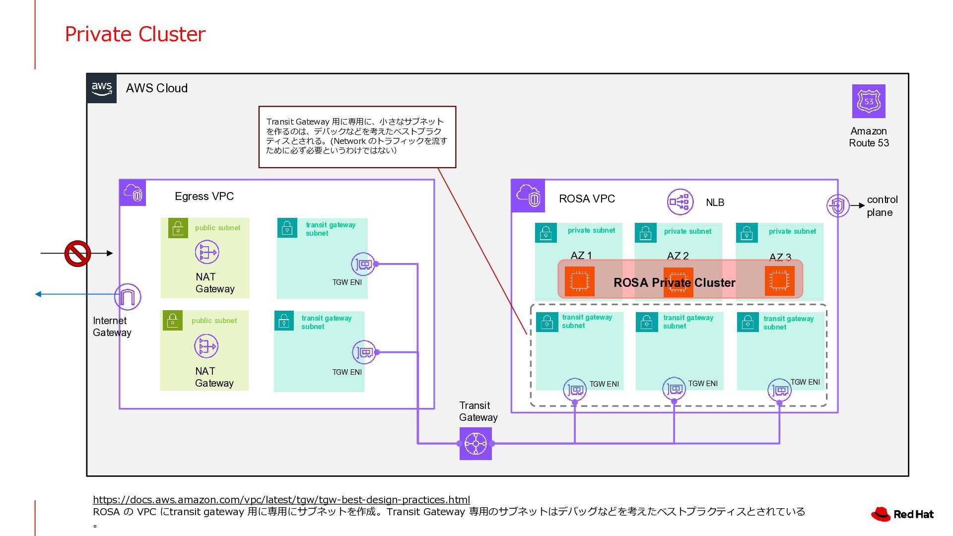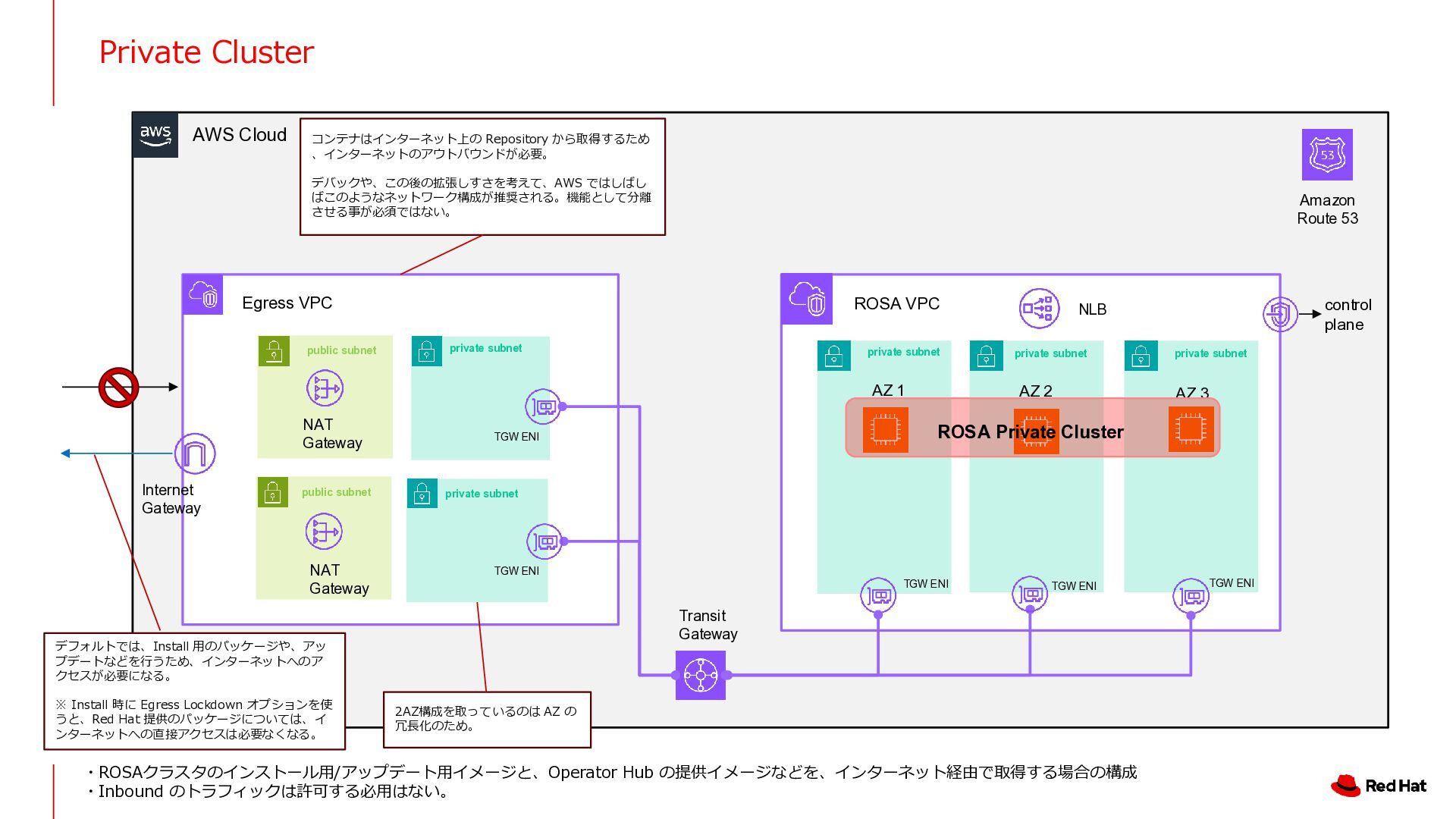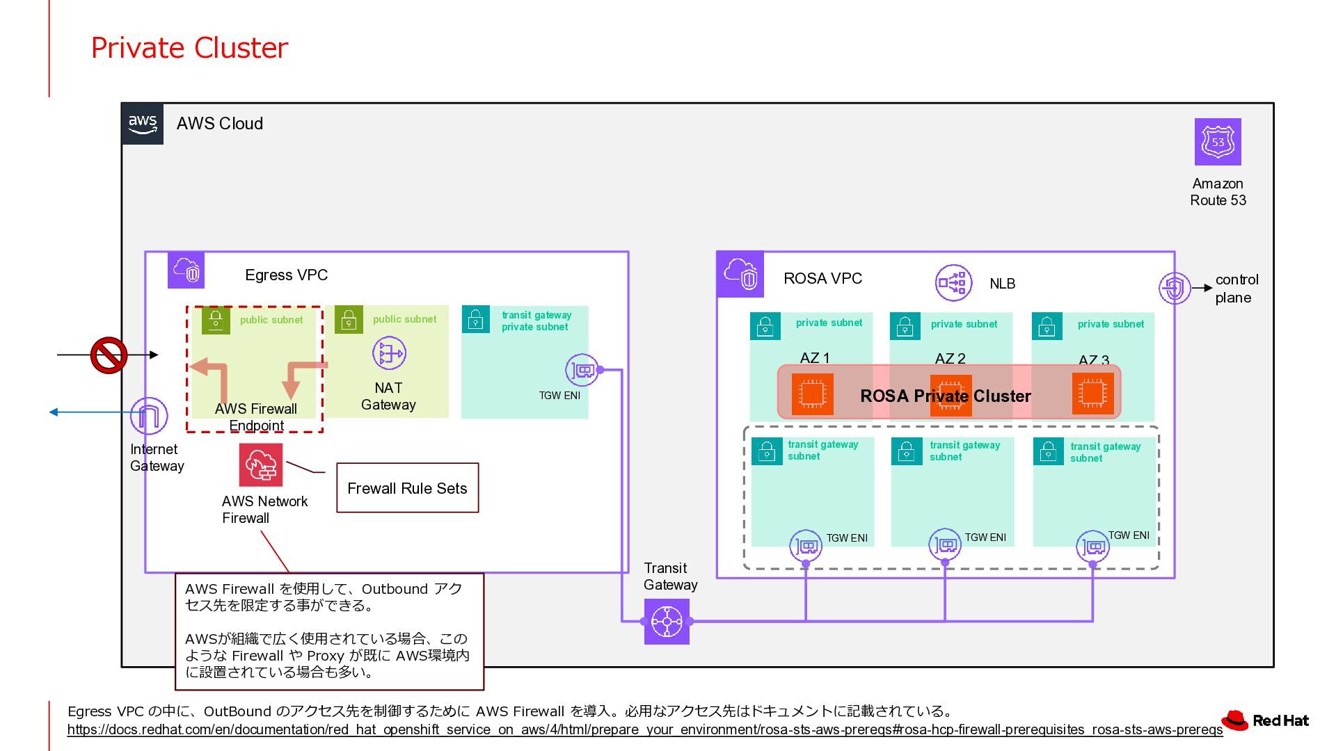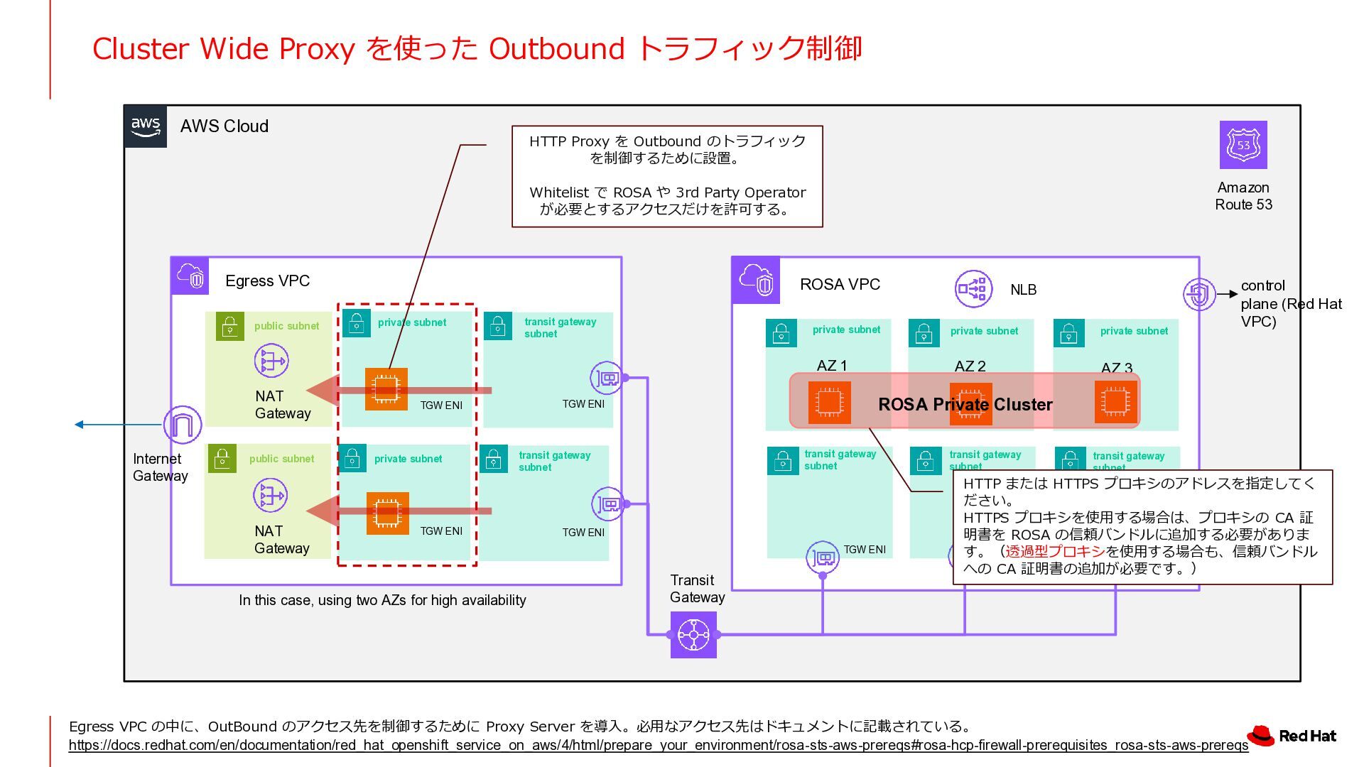 ROSA VPC AZ 1 AZ 2 AZ 3 control plane (Red Hat VPC) NLB NAT Gateway Transit Gateway Amazon Route 53 Internet Gateway NAT Gateway transit gateway subnet transit gateway subnet transit gateway subnet transit gateway subnet transit gateway subnet private subnet private subnet private subnet public subnet public subnet TGW ENI TGW ENI TGW ENI TGW ENI TGW ENI private subnet private subnet TGW ENI TGW ENI HTTP または HTTPS プロキシのアドレスを指定してく ださい。 HTTPS プロキシを使用する場合は、プロキシの CA 証 明書を ROSA の信頼バンドルに追加する必要がありま す。(透過型プロキシを使用する場合も、信頼バンドル への CA 証明書の追加が必要です。) ROSA Private Cluster In this case, using two AZs for high availability HTTP Proxy を Outbound のトラフィック を制御するために設置。 Whitelist で ROSA や 3rd Party Operator が必要とするアクセスだけを許可する。 Egress VPC の中に、OutBound のアクセス先を制御するために Proxy Server を導入。必用なアクセス先はドキュメントに記載されている。 https://docs.redhat.com/en/documentation/red_hat_openshift_service_on_aws/4/html/prepare_your_environment/rosa-sts-aws-prereqs#rosa-hcp-firewall-prerequisites_rosa-sts-aws-prereqs