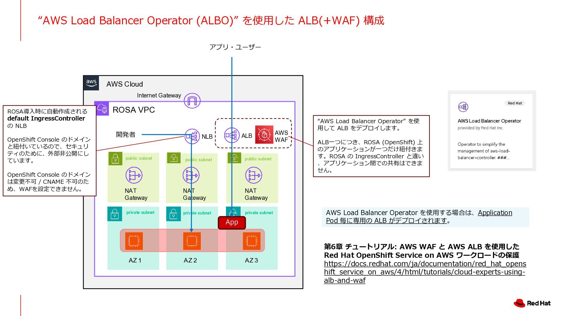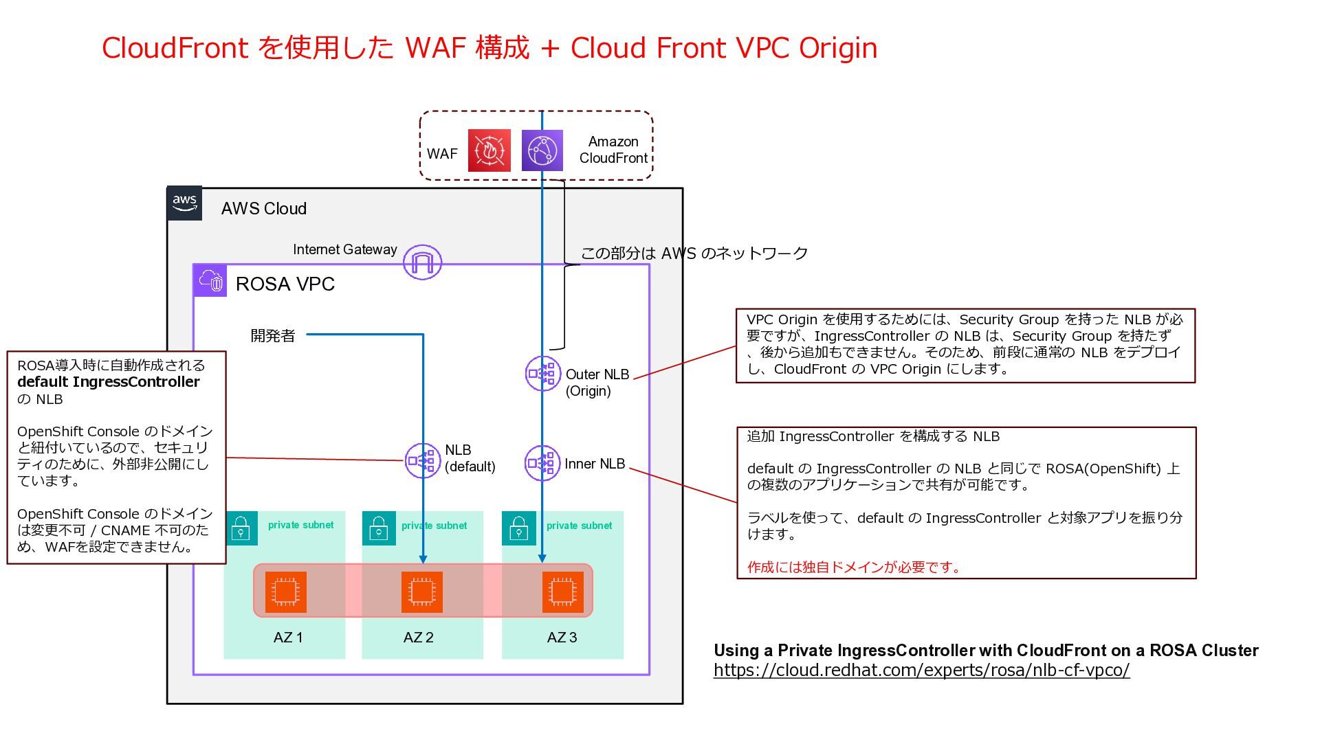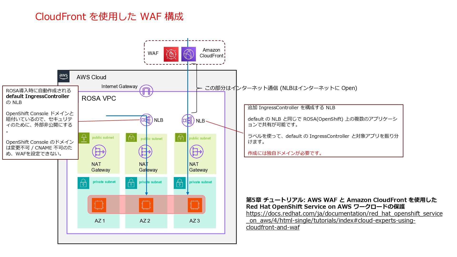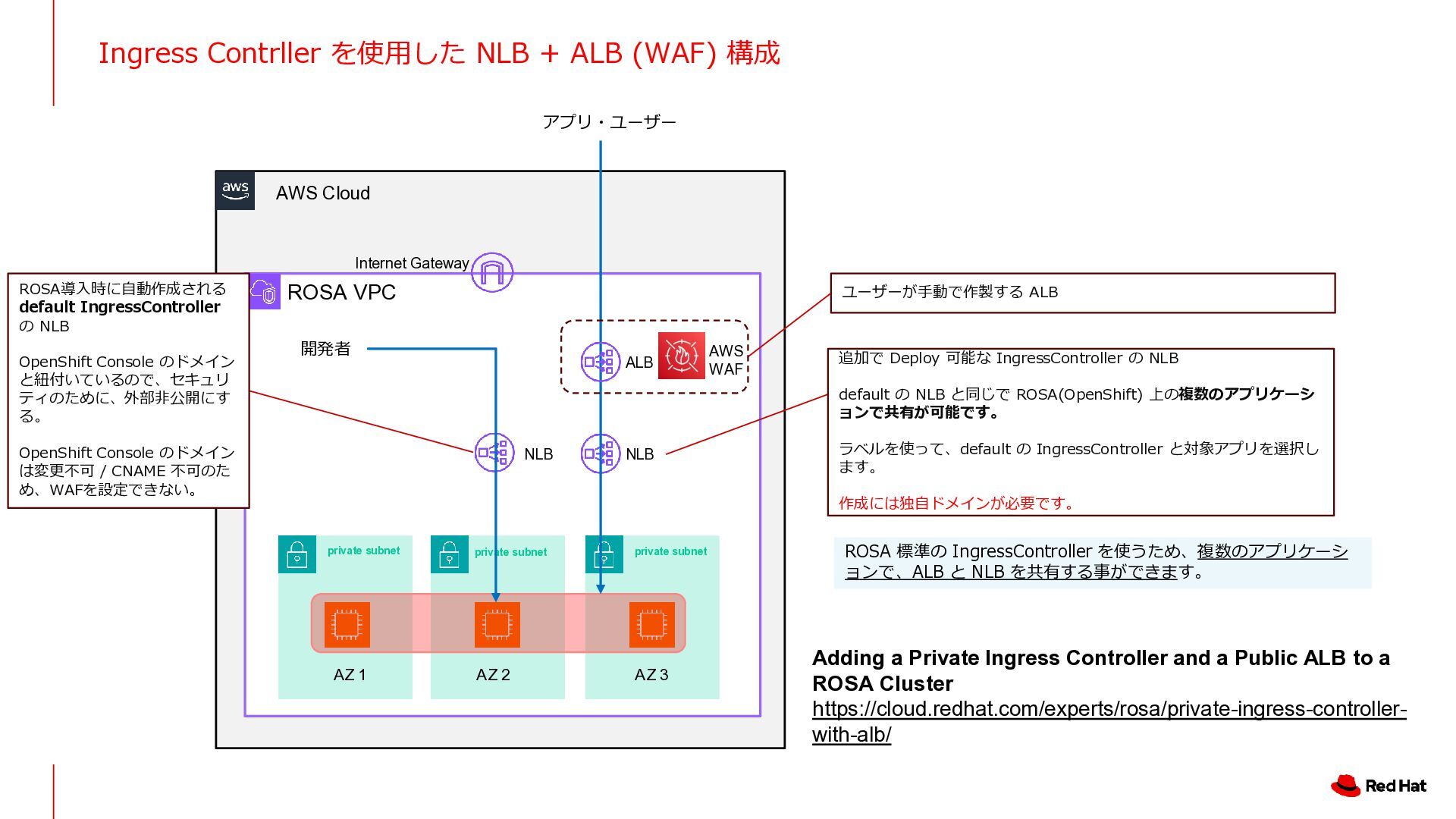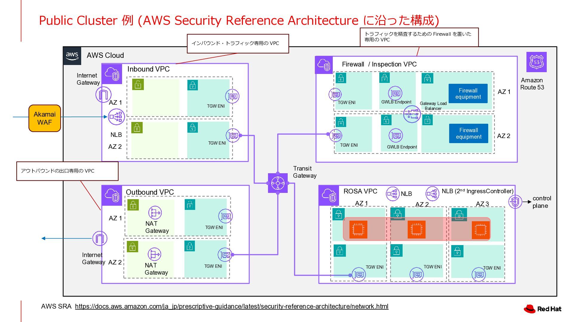 Outbound VPC Inbound VPC ROSA VPC AZ 1 AZ 2 AZ 3 control plane NLB (2nd IngressController) NLB Transit Gateway Amazon Route 53 Firewall / Inspection VPC Gateway Load Balancer Internet Gateway Internet Gateway Firewall equipment NAT Gateway NAT Gateway Firewall equipment AZ 1 AZ 2 AZ 1 AZ 2 AZ 1 AZ 2 TGW ENI TGW ENI GWLB Endpoint GWLB Endpoint TGW ENI TGW ENI TGW ENI TGW ENI TGW ENI TGW ENI TGW ENI トラフィックを精査するための Firewall を置いた 専用の VPC インバウンド・トラフィック専用の VPC アウトバウンドの出口専用の VPC Akamai WAF AWS SRA https://docs.aws.amazon.com/ja_jp/prescriptive-guidance/latest/security-reference-architecture/network.html NLB