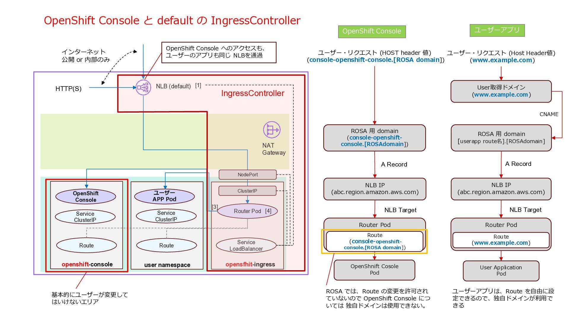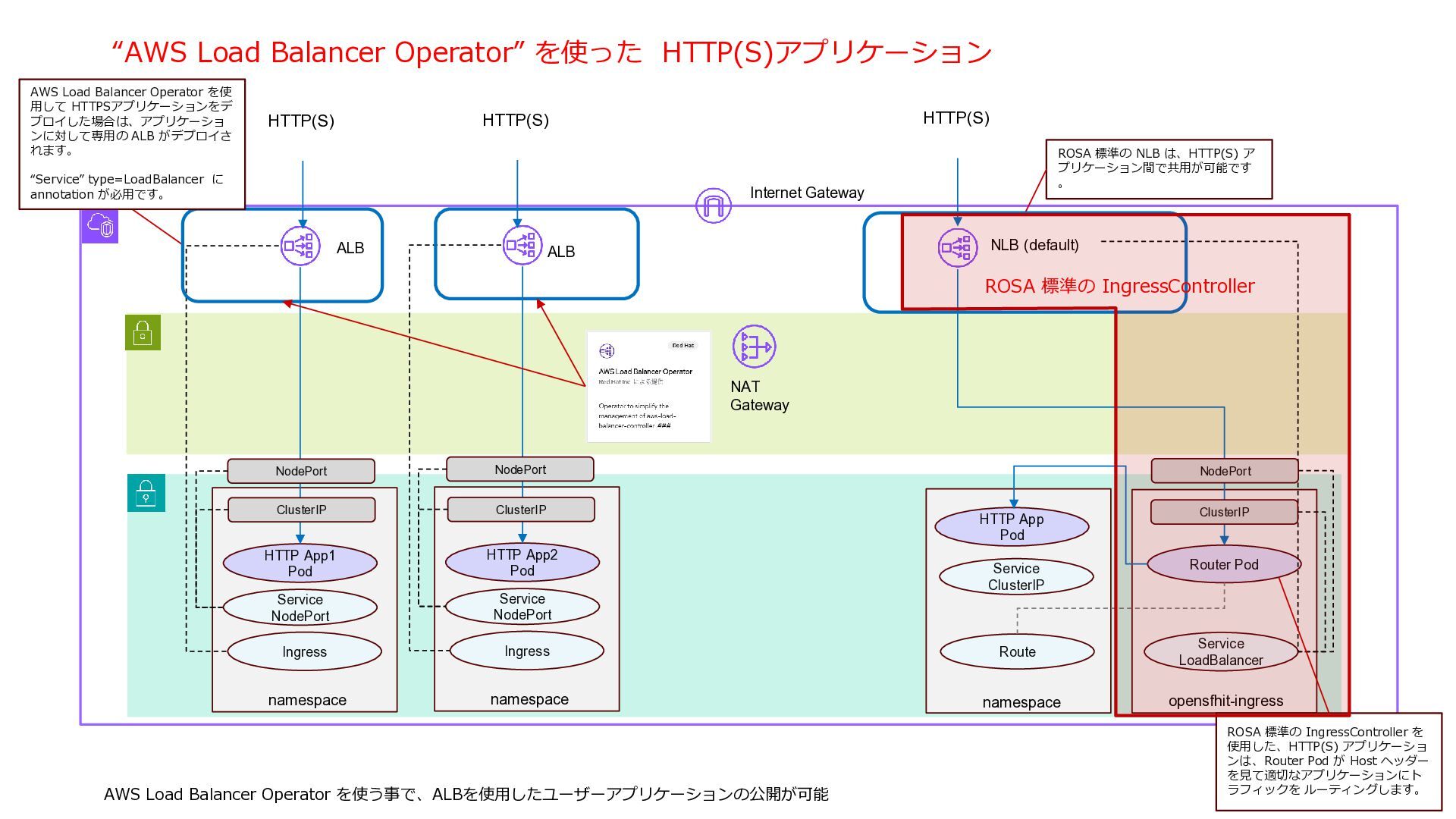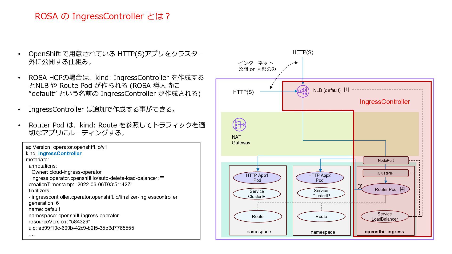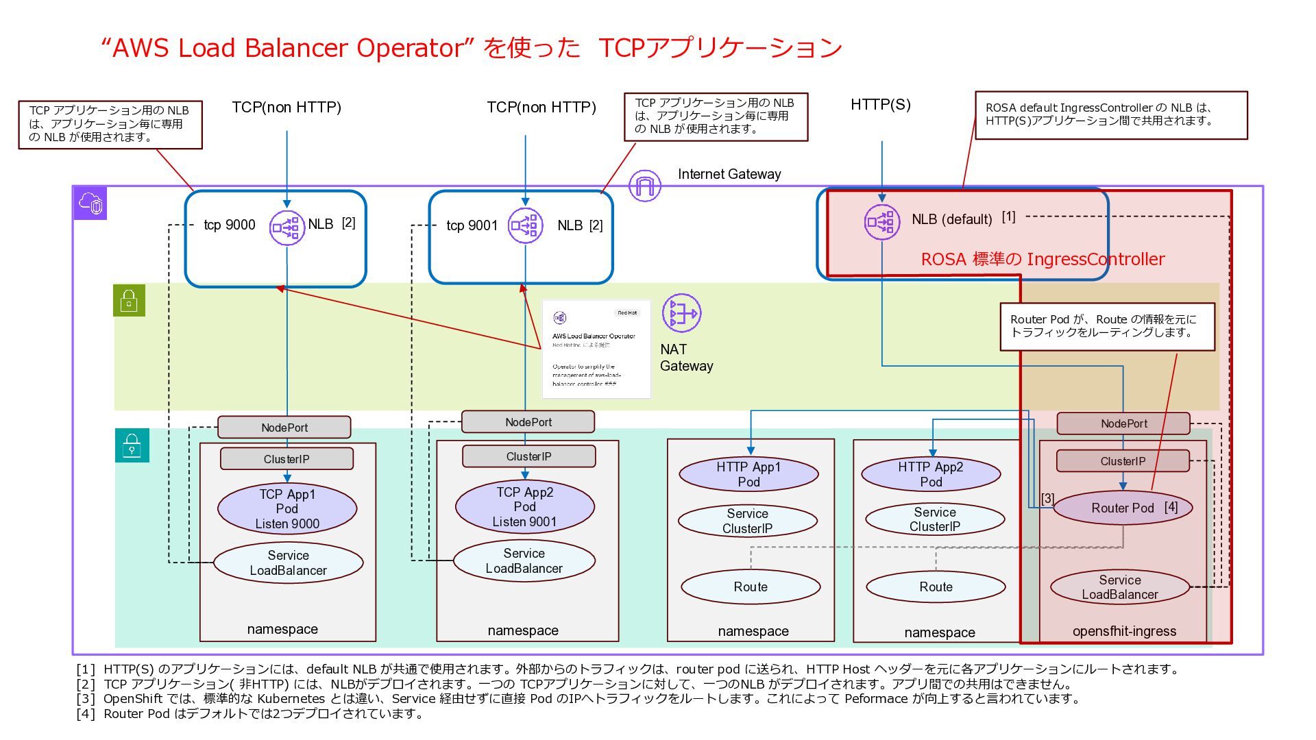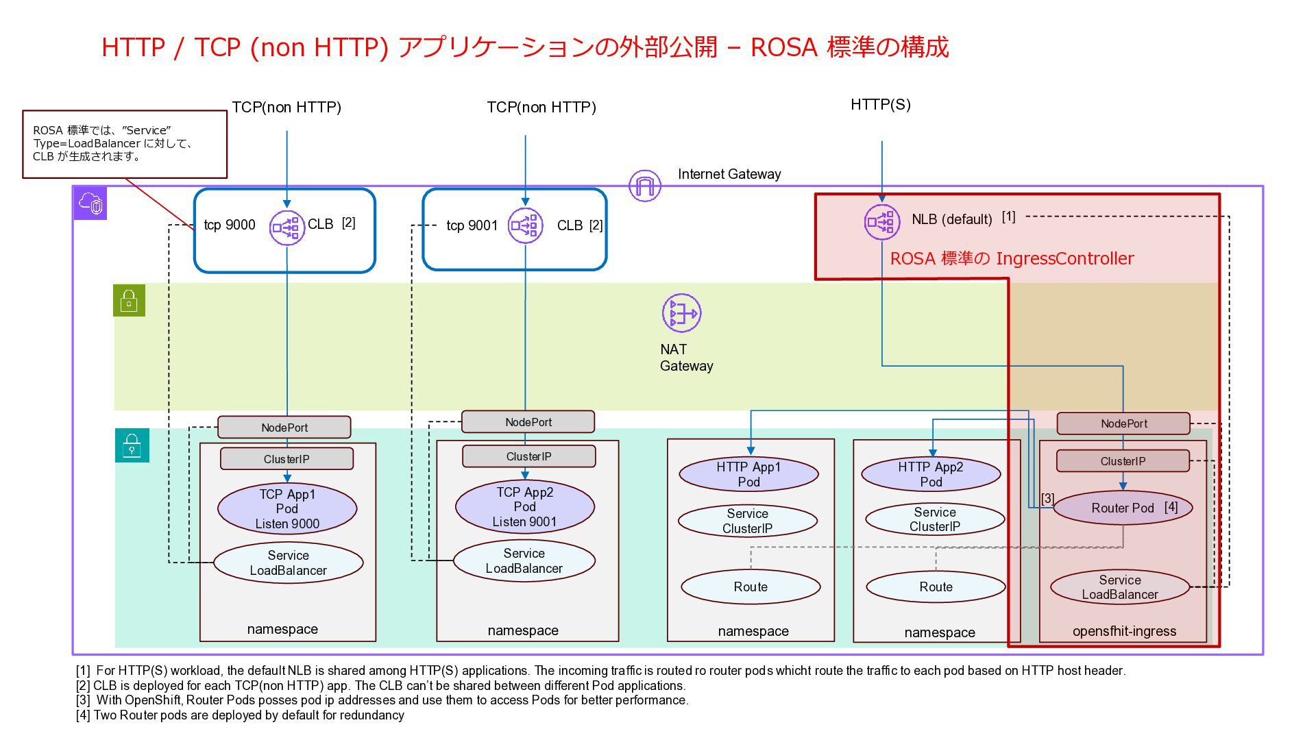 NAT Gateway Internet Gateway NLB (default) Service LoadBalancer Service LoadBalancer CLB tcp 9000 tcp 9001 HTTP App1 Pod HTTP App2 Pod Router Pod Route Route TCP(non HTTP) TCP(non HTTP) HTTP(S) namespace namespace namespace namespace opensfhit-ingress [4] [1] For HTTP(S) workload, the default NLB is shared among HTTP(S) applications. The incoming traffic is routed ro router pods whicht route the traffic to each pod based on HTTP host header. [2] CLB is deployed for each TCP(non HTTP) app. The CLB can’t be shared between different Pod applications. [3] With OpenShift, Router Pods posses pod ip addresses and use them to access Pods for better performance. [4] Two Router pods are deployed by default for redundancy [3] [2] [2] [1] Service LoadBalancer NodePort NodePort NodePort TCP App1 Pod Listen 9000 TCP App2 Pod Listen 9001 ClusterIP ClusterIP ClusterIP Service ClusterIP Service ClusterIP ROSA 標準の IngressController ROSA 標準では、”Service” Type=LoadBalancer に対して、 CLB が生成されます。