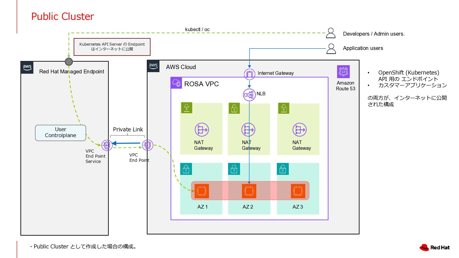 AZ 3 NLB NAT Gateway NAT Gateway NAT Gateway Amazon Route 53 Internet Gateway Application users Developers / Admin users. Red Hat Managed Endpoint Private Link VPC End Point Service VPC End Point kubectl / oc Kubernetes API Server の Endpoint はインターネットに公開 User Controlplane • OpenShift (Kubernetes) API 用の エンドポイント • カスタマーアプリケーション の両方が、インターネットに公開 された構成 ・Public Cluster として作成した場合の構成。