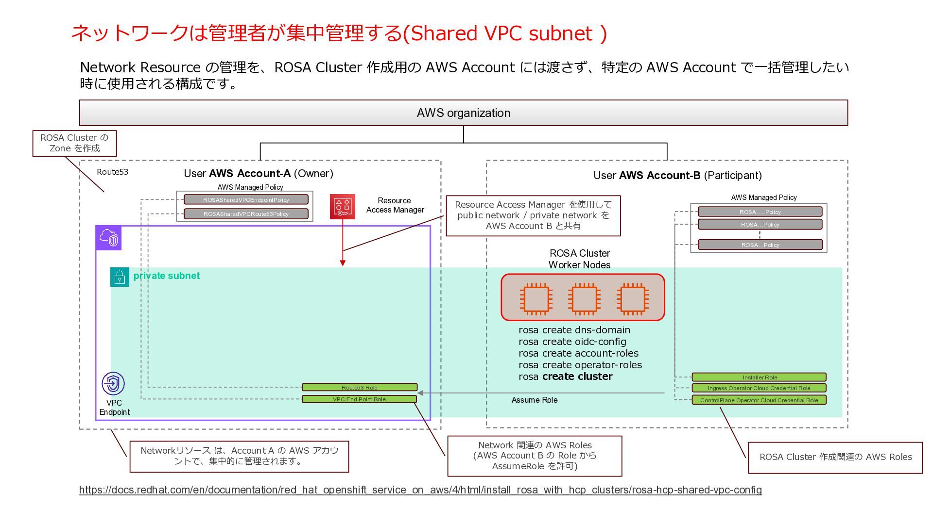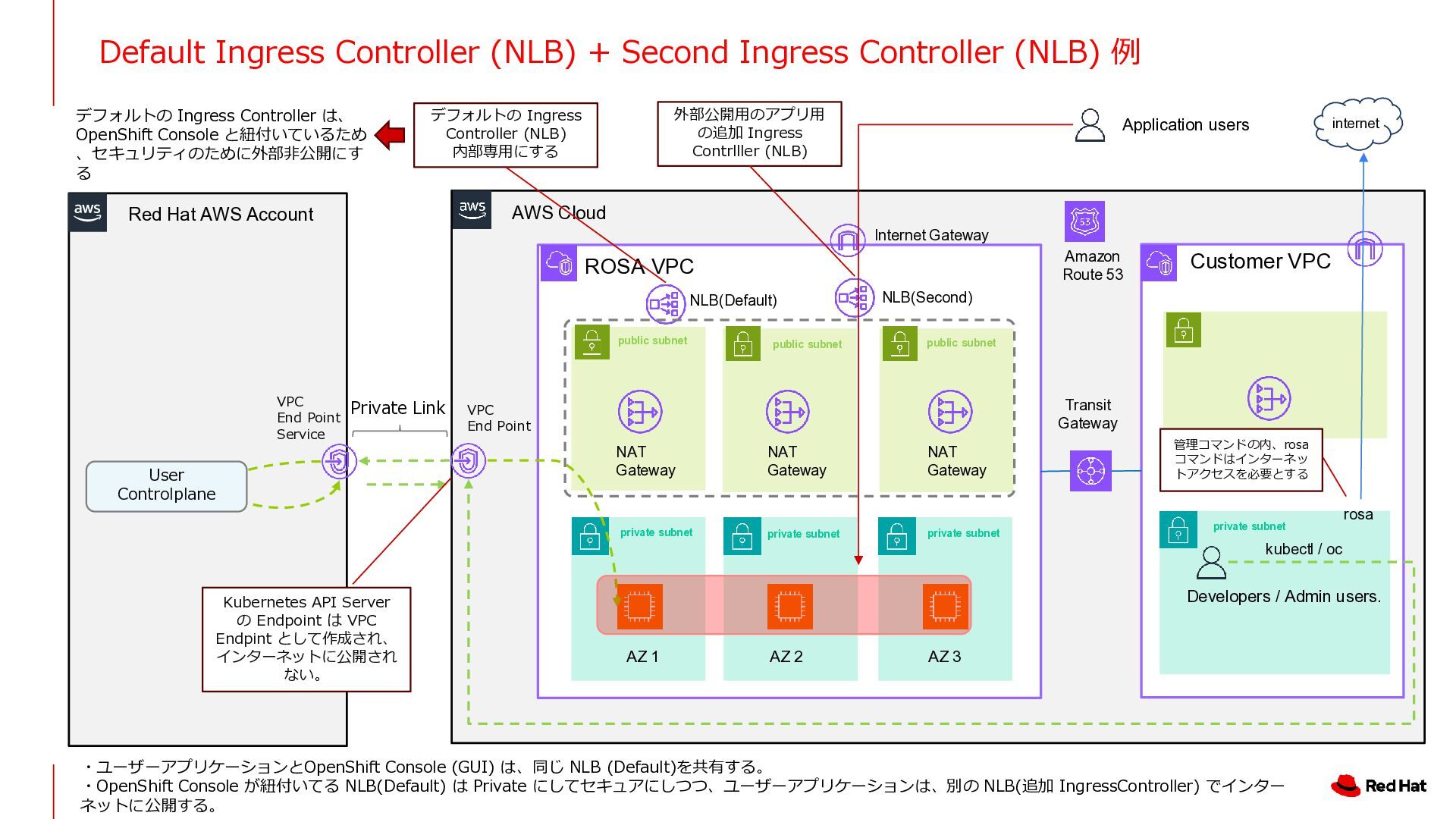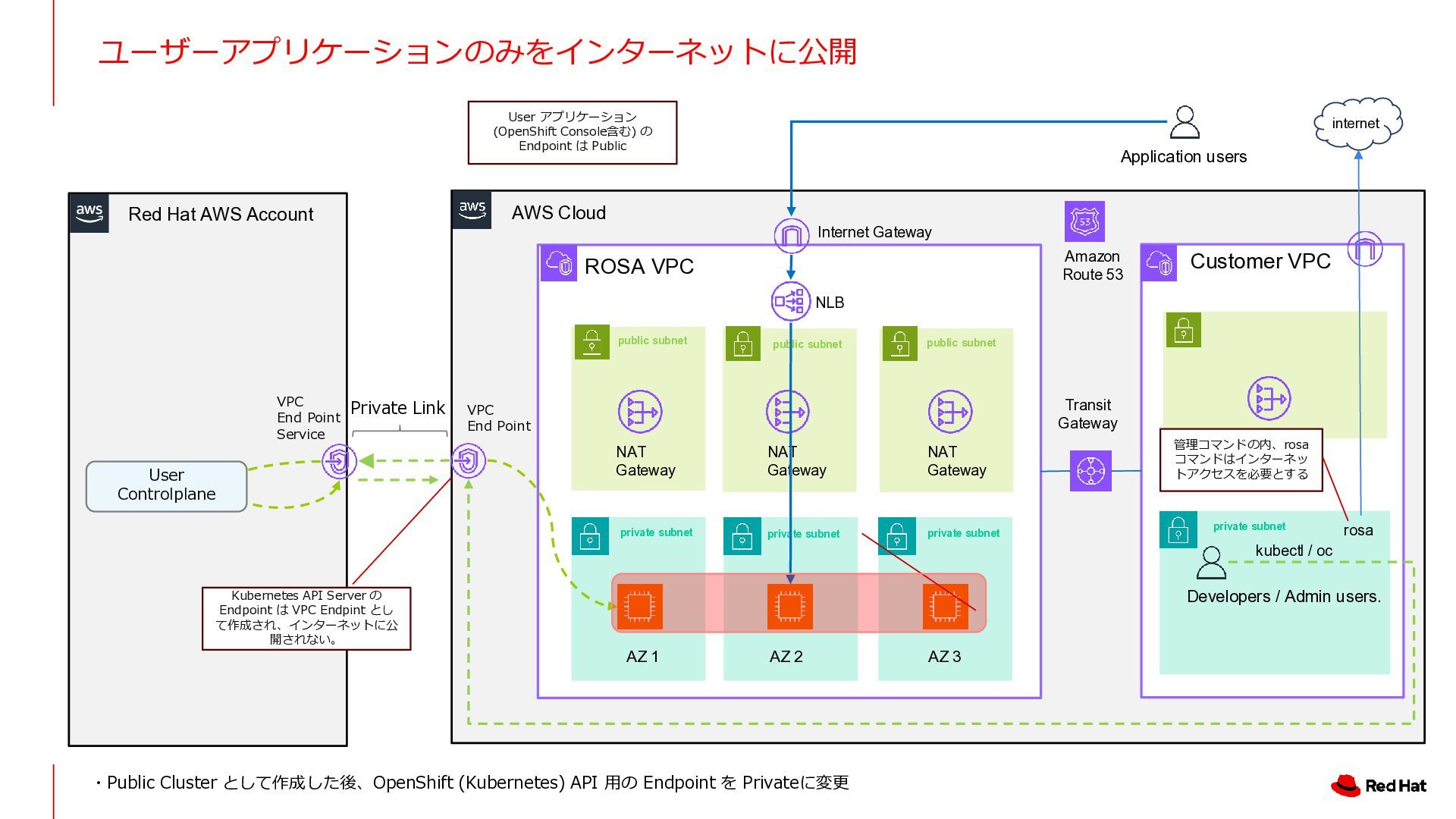 3 NLB NAT Gateway NAT Gateway NAT Gateway Amazon Route 53 Internet Gateway Private Link VPC End Point Service VPC End Point Customer VPC Application users Developers / Admin users. Transit Gateway private subnet private subnet private subnet public subnet public subnet public subnet private subnet kubectl / oc Kubernetes API Server の Endpoint は VPC Endpint とし て作成され、インターネットに公 開されない。 User Controlplane Red Hat AWS Account User アプリケーション (OpenShift Console含む) の Endpoint は Public internet rosa 管理コマンドの内、rosa コマンドはインターネッ トアクセスを必要とする ・Public Cluster として作成した後、OpenShift (Kubernetes) API 用の Endpoint を Privateに変更
