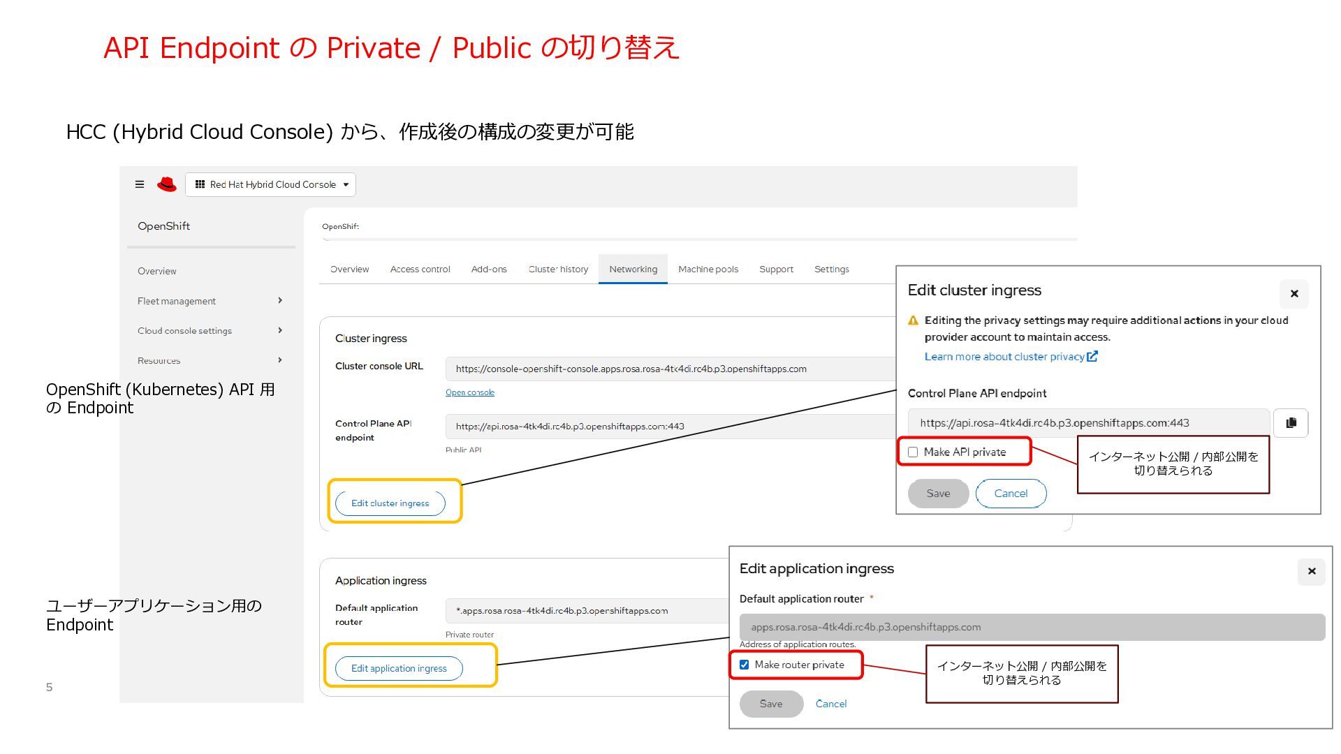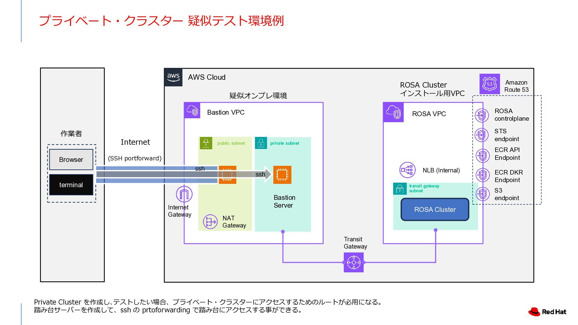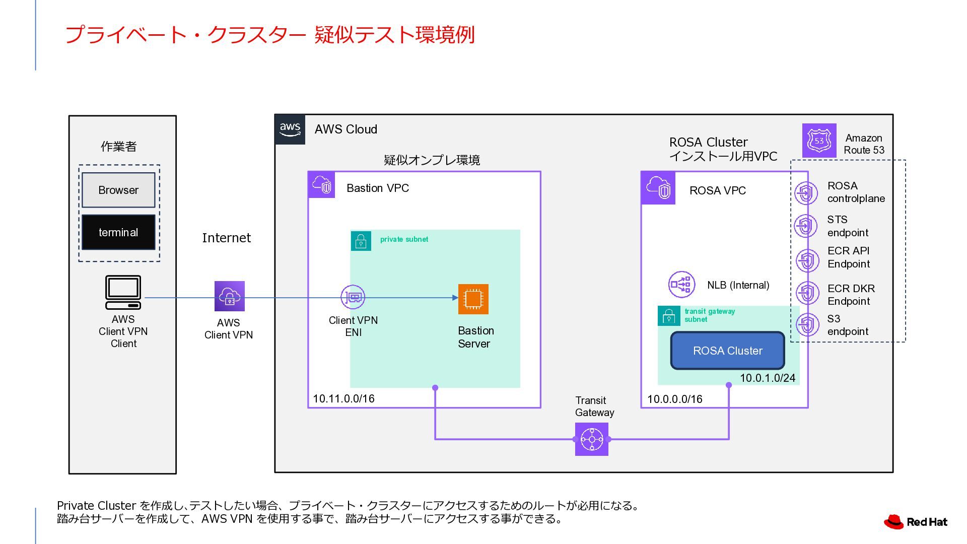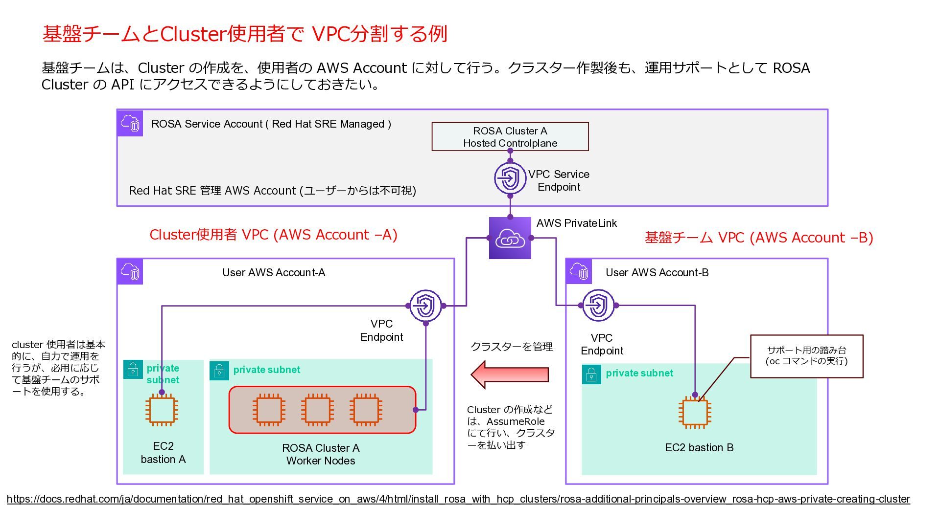 3 NLB NAT Gateway NAT Gateway NAT Gateway Amazon Route 53 Internet Gateway Private Link VPC End Point Service VPC End Point Customer VPC Application users Developers / Admin users. Transit Gateway private subnet private subnet private subnet public subnet public subnet public subnet private subnet kubectl / oc Kubernetes API Server の Endpoint は VPC Endpint とし て作成され、インターネットに公 開されない。 User Controlplane Red Hat AWS Account User アプリケーション (OpenShift Console含む) の Endpoint は Public internet rosa 管理コマンドの内、rosa コマンドはインターネッ トアクセスを必要とする ・Public Cluster として作成した後、OpenShift (Kubernetes) API 用の Endpoint を Privateに変更