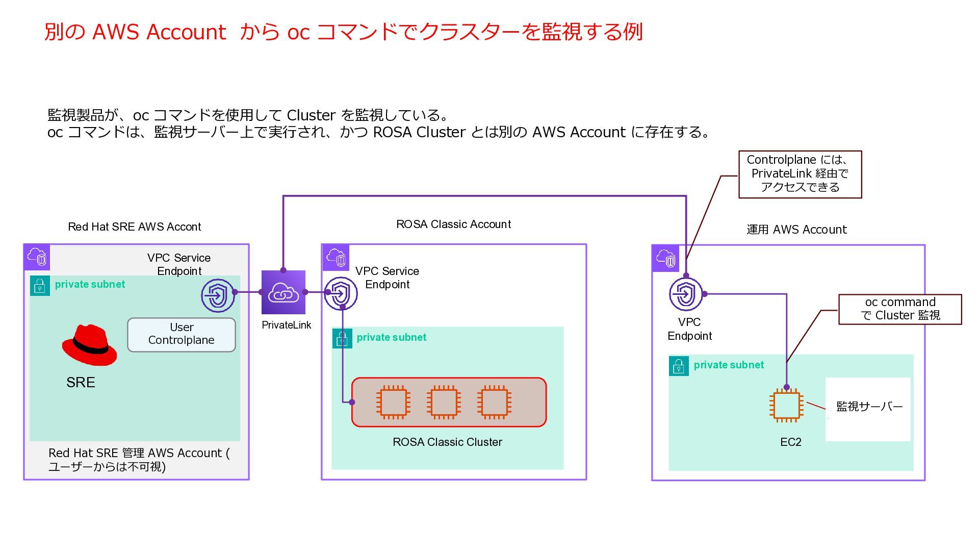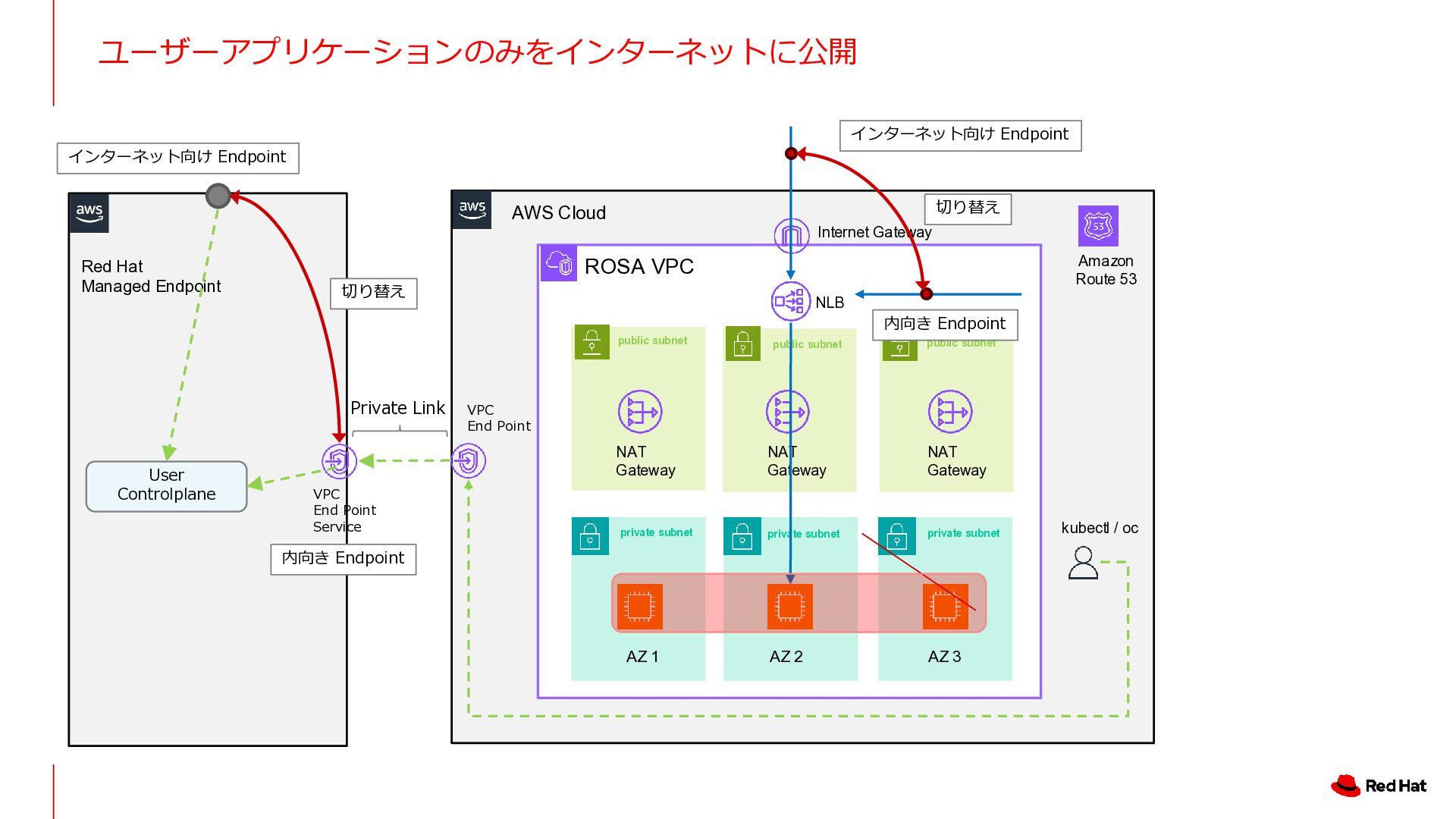 3 NLB NAT Gateway NAT Gateway NAT Gateway Amazon Route 53 Internet Gateway Private Link VPC End Point Service VPC End Point private subnet private subnet private subnet public subnet public subnet public subnet User Controlplane Red Hat Managed Endpoint インターネット向け Endpoint インターネット向け Endpoint 内向き Endpoint 内向き Endpoint 切り替え 切り替え kubectl / oc