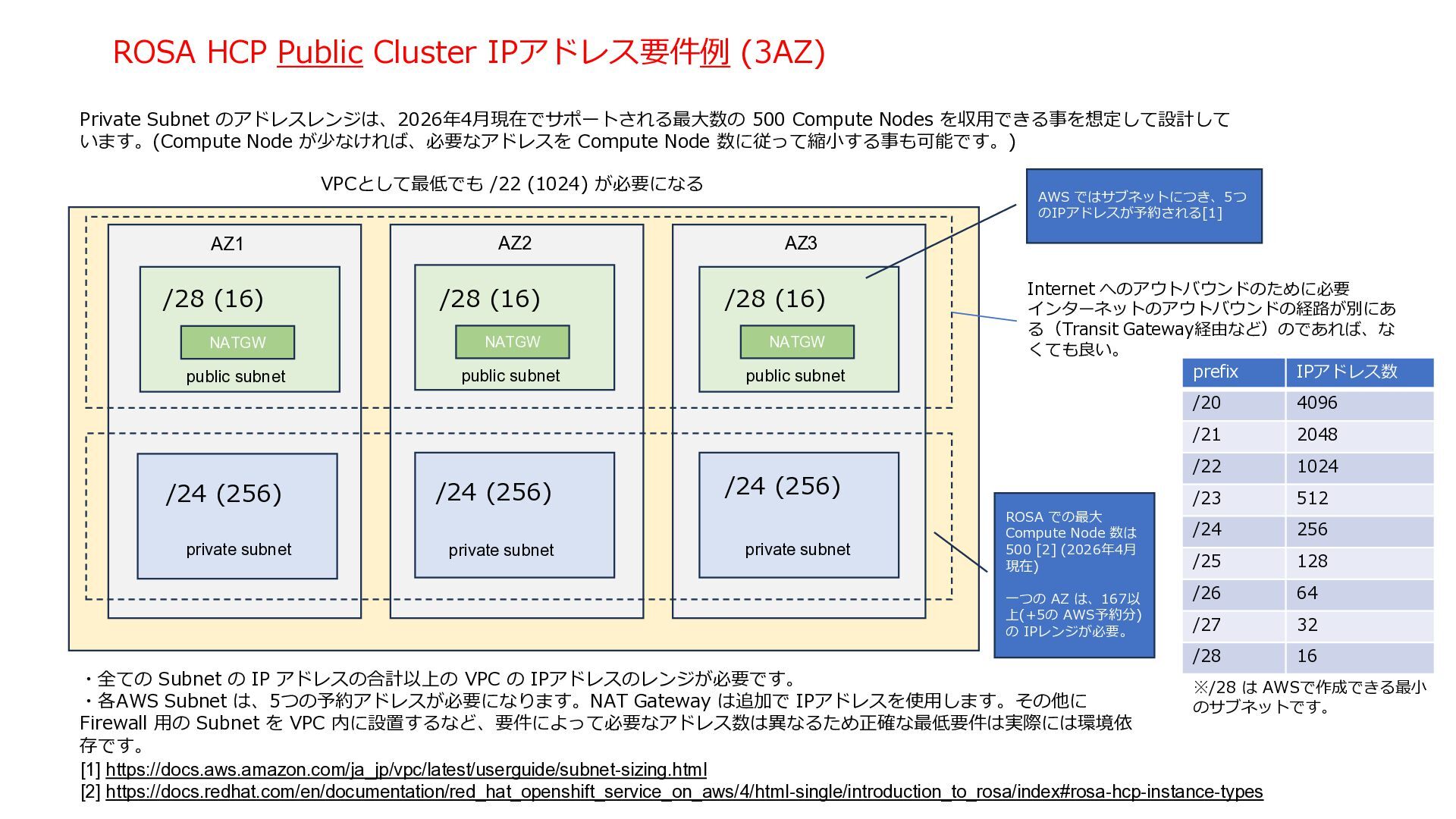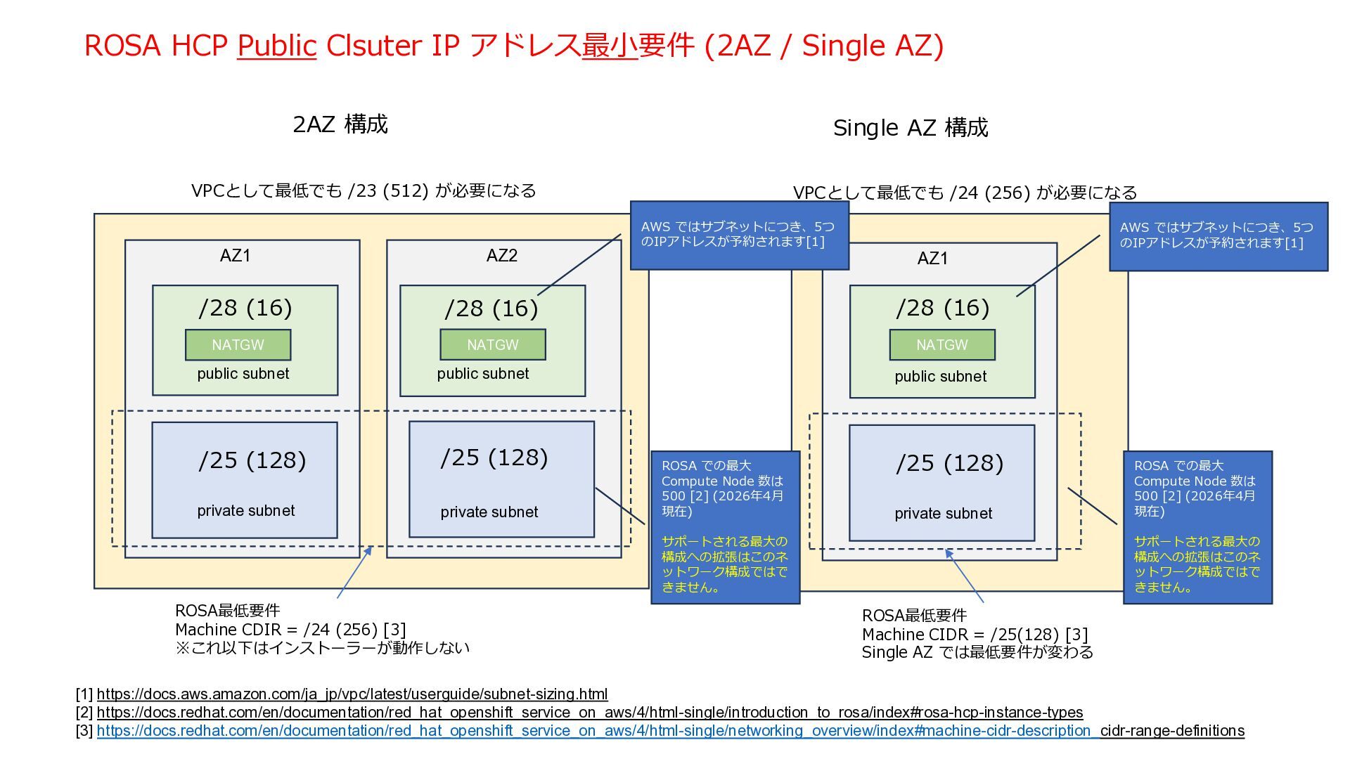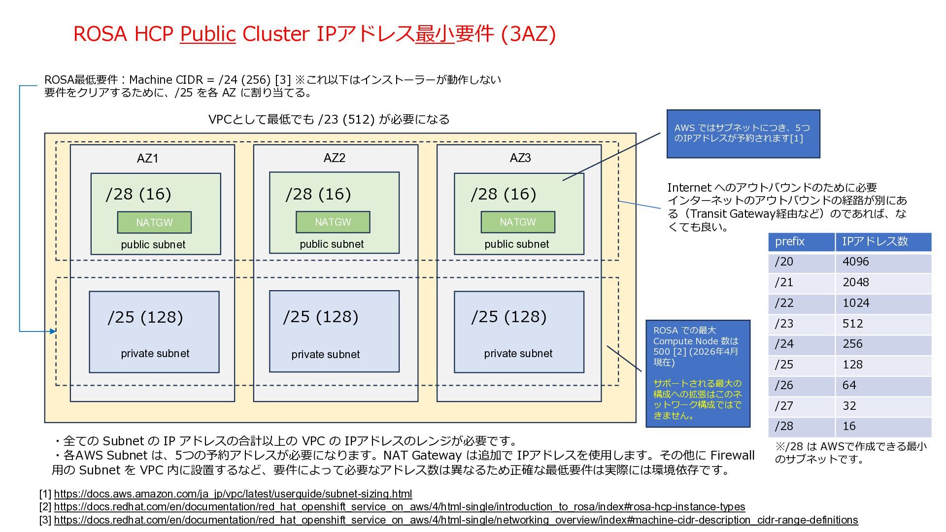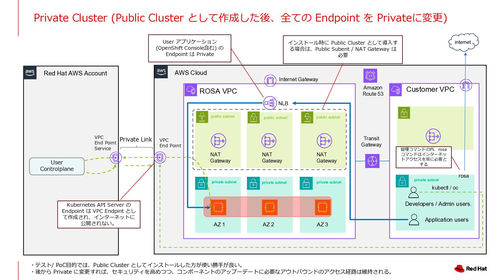 ROSA VPC AZ 1 AZ 2 AZ 3 NLB NAT Gateway NAT Gateway NAT Gateway Amazon Route 53 Internet Gateway Private Link VPC End Point Service VPC End Point Customer VPC Application users Developers / Admin users. Transit Gateway private subnet private subnet private subnet public subnet public subnet public subnet private subnet kubectl / oc User Controlplane Red Hat AWS Account インストール時に Public Cluster として導入す る場合は、Public Subent / NAT Gateway は 必要 Kubernetes API Server の Endpoint は VPC Endpint とし て作成され、インターネットに 公開されない。 User アプリケーション (OpenShift Console含む) の Endpoint は Private internet rosa 管理コマンドの内、rosa コマンドはインターネッ トアクセスを常に必要と する ・テスト/ PoC目的では、Public Cluster としてインストールした方が使い勝手が良い。 ・後から Private に変更すれば、セキュリティを高めつつ、コンポーネントのアップーデートに必要なアウトバウンドのアクセス経路は維持される。