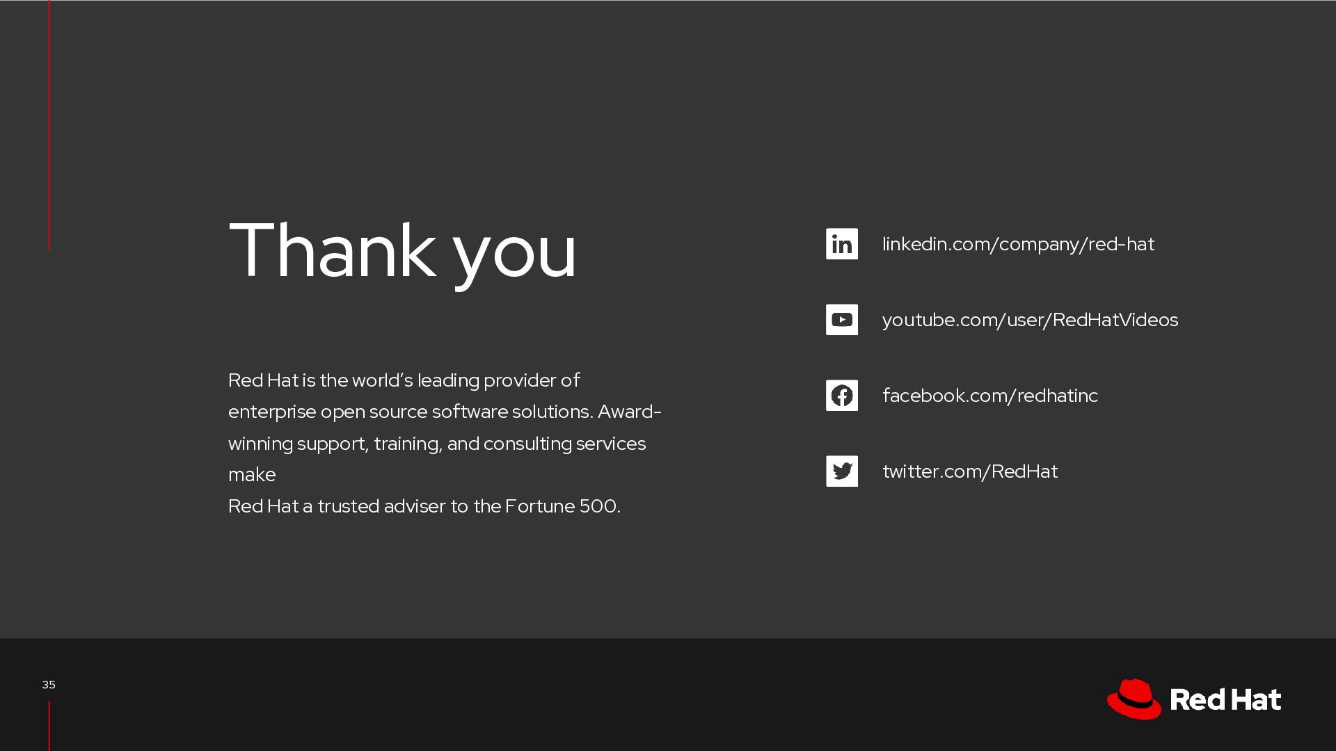 leading provider of enterprise open source software solutions. Award- winning support, training, and consulting services make Red Hat a trusted adviser to the Fortune 500. Thank you