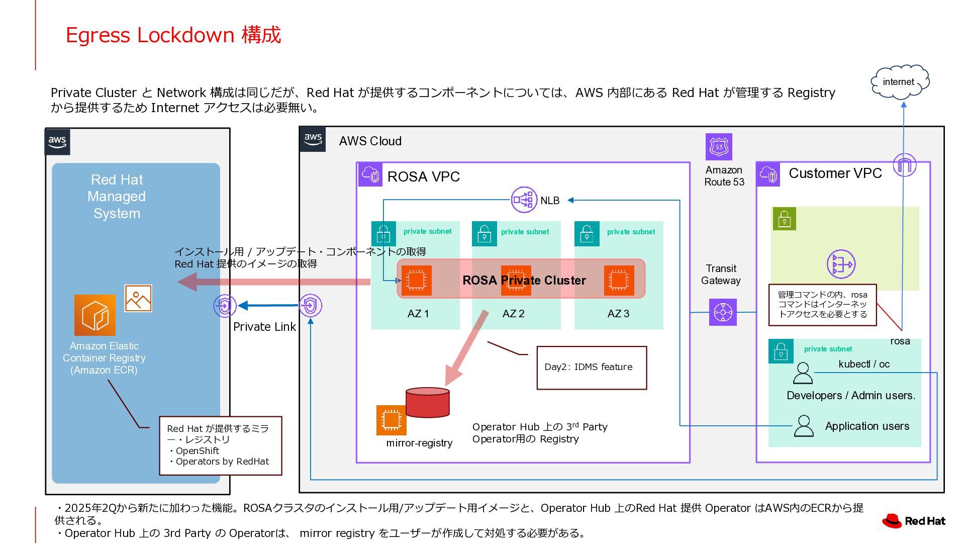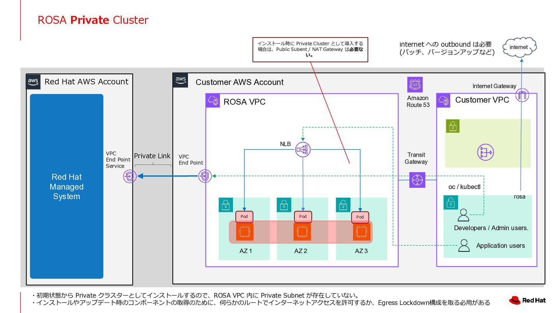 AZ 2 AZ 3 NLB Amazon Route 53 Private Link VPC End Point Red Hat Managed System Customer VPC Application users Developers / Admin users. Transit Gateway Internet Gateway internet internet への outbound は必要 (パッチ、バージョンアップなど) oc / kubectl Pod Pod Pod VPC End Point Service Red Hat AWS Account インストール時に Private Cluster として導入する 場合は、Public Subent / NAT Gateway は必要な い。 rosa ・初期状態から Private クラスターとしてインストールするので、ROSA VPC 内に Private Subnet が存在していない。 ・インストールやアップデート時のコンポーネントの取得のために、何らかのルートでインターネットアクセスを許可するか、Egress Lockdown構成を取る必用がある