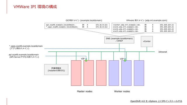 VIP api.ocp48.example.localdomain (API Serverアクセス用ドメイン) OpenShift 4.8 を vSphere 上にIPIインストールする DNS (example.localdomain) / DHCP vCenter Intranet api.ocp48.example.localdomain. IN A 172.16.0.111 *.apps.ocp48.example.localdomain. IN A 172.16.0.112 vcenter.adp.nrt.example.com. IN A 192.168.124.11 esxi1.adp.nrt.example.com. IN A 192.168.124.21 esxi2.adp.nrt.example.com. IN A 192.168.124.22 esxi3.adp.nrt.example.com. IN A 192.168.124.23 OCP用ドメイン (example.localdomain) VMware 用ドメイン (adp.nrt.example.com) 作業用端末 (installerの実行元)