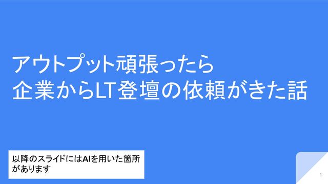 アウトプット頑張ったら 企業からLT登壇の依頼がきた話 1 以降のスライドにはAIを用いた箇所 があります
