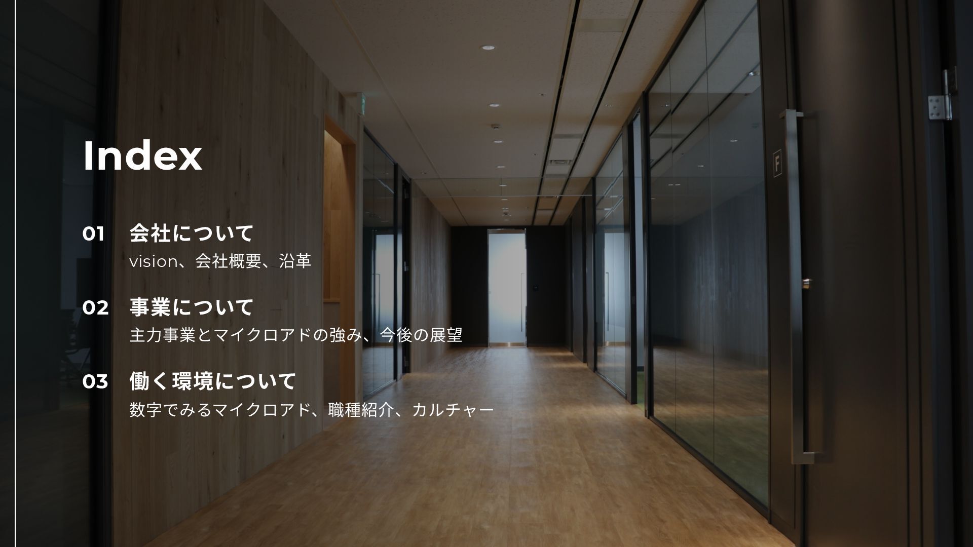 Index 01 会社について vision、会社概要、沿⾰ 02 事業について 主⼒事業とマイクロアドの強み、今後の展望 03 働く環境について 数字でみるマイクロアド、職種紹介、カルチャー