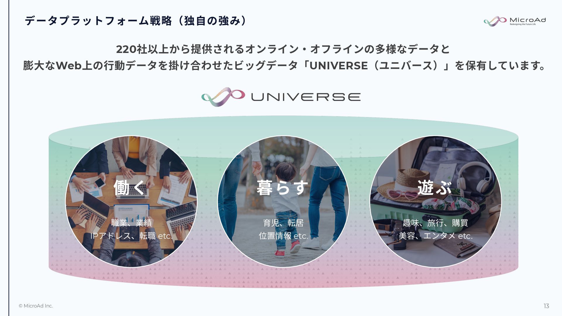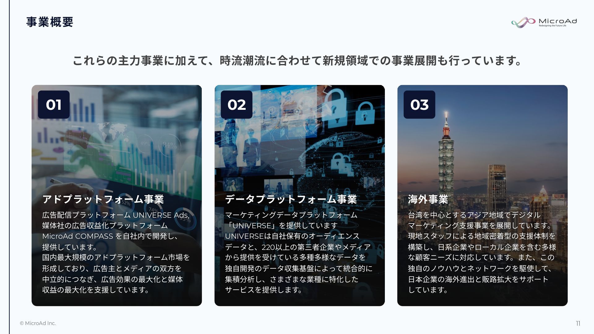 媒体社の広告収益化プラットフォーム MicroAd COMPASS を⾃社内で開発し、 提供しています。 国内最⼤規模のアドプラットフォーム市場を 形成しており、広告主とメディアの双⽅を 中⽴的につなぎ、広告効果の最⼤化と媒体 収益の最⼤化を⽀援しています。 データプラットフォーム事業 マーケティングデータプラットフォーム 「UNIVERSE」を提供しています UNIVERSEは⾃社保有のオーディエンス データと、220以上の第三者企業やメディア から提供を受けている多種多様なデータを 独⾃開発のデータ収集基盤によって統合的に 集積分析し、さまざまな業種に特化した サービスを提供します。 海外事業 台湾を中⼼とするアジア地域でデジタル マーケティング⽀援事業を展開しています。 現地スタッフによる地域密着型の⽀援体制を 構築し、⽇系企業やローカル企業を含む多様 な顧客ニーズに対応しています。また、この 独⾃のノウハウとネットワークを駆使して、 ⽇本企業の海外進出と販路拡⼤をサポート しています。 01 02 03