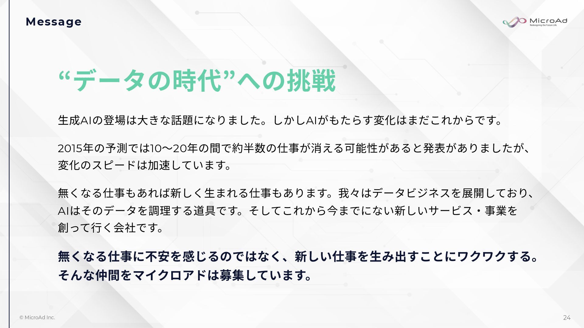 Message © MicroAd Inc. 24 “データの時代”への挑戦 ⽣成AIの登場は⼤きな話題になりました。しかしAIがもたらす変化はまだこれからです。 2015年の予測では10〜20年の間で約半数の仕事が消える可能性があると発表がありましたが、 変化のスピードは加速しています。 無くなる仕事もあれば新しく⽣まれる仕事もあります。我々はデータビジネスを展開しており、