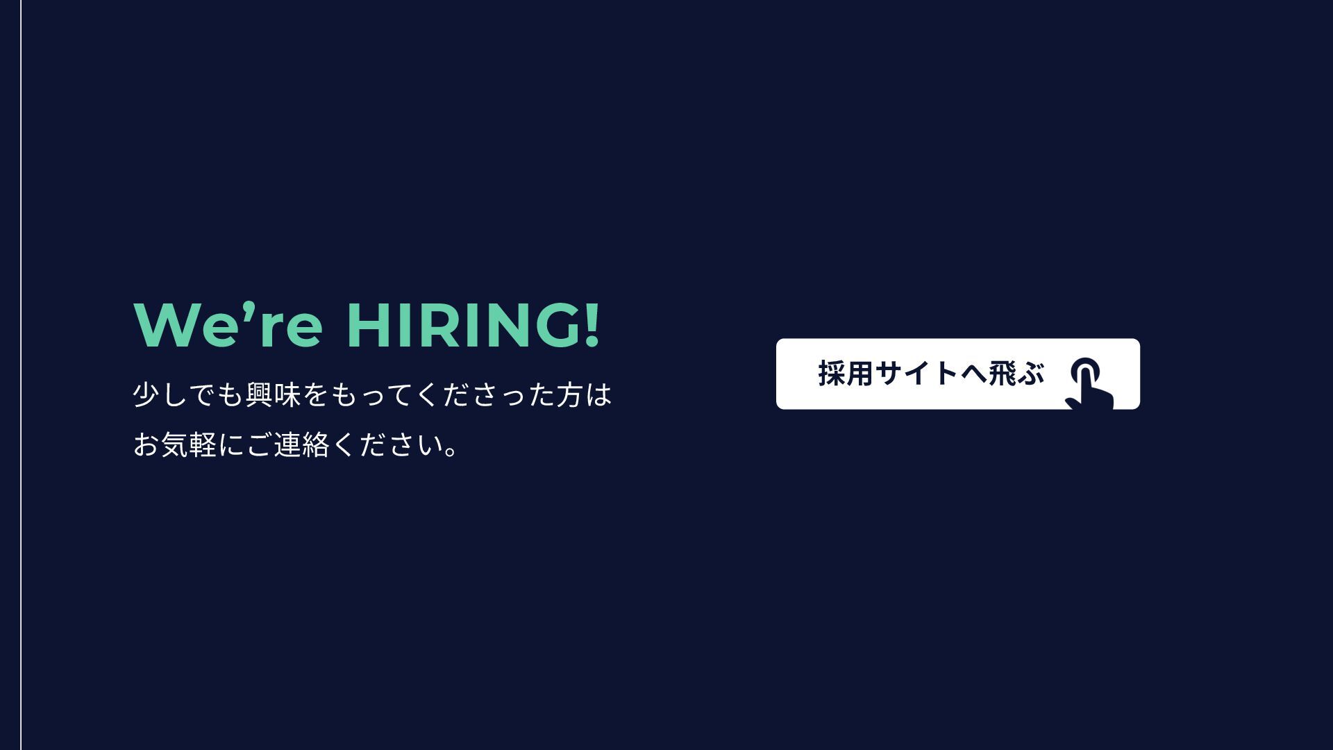 We’re HIRING! 少しでも興味をもってくださった⽅は お気軽にご連絡ください。 採⽤サイトへ⾶ぶ