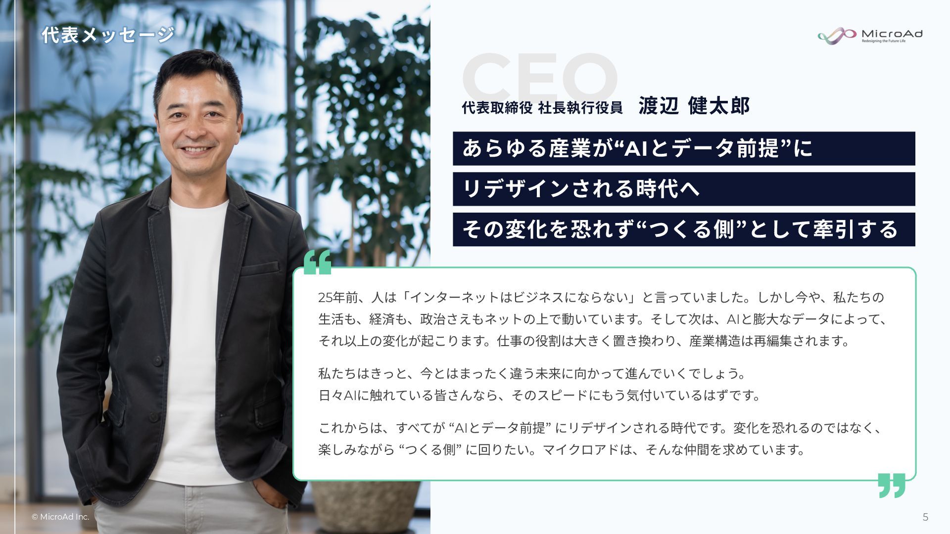 ⽇々AIに触れている皆さんなら、そのスピードにもう気付いているはずです。 これからは、すべてが “AIとデータ前提” にリデザインされる時代です。変化を恐れるのではなく、 楽しみながら “つくる側” に回りたい。マイクロアドは、そんな仲間を求めています。 代表取締役 社⻑執⾏役員 渡辺 健太郎 あらゆる産業が“AIとデータ前提”に リデザインされる時代へ その変化を恐れず“つくる側”として牽引する