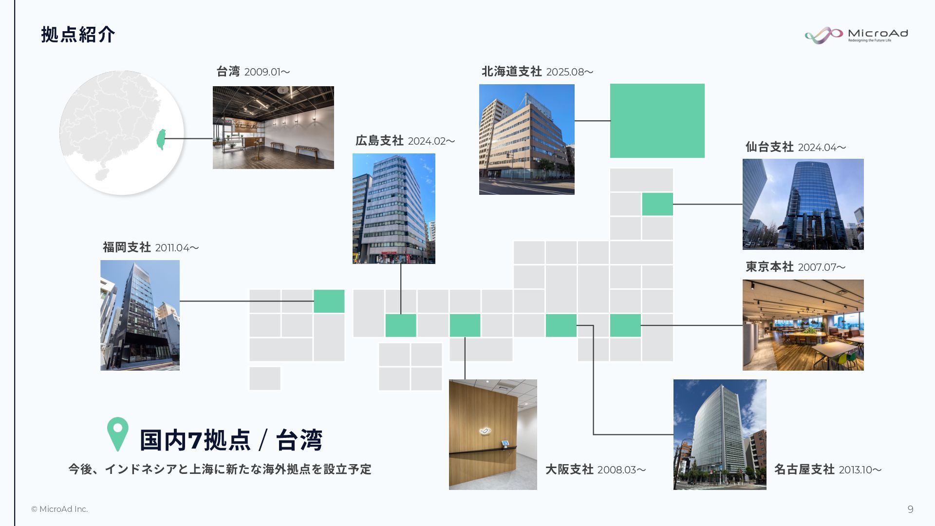 2007.07〜 名古屋⽀社 2013.10〜 台湾 2009.01〜 国内7拠点 / 台湾 今後、インドネシアと上海に新たな海外拠点を設⽴予定 ⼤阪⽀社 2008.03〜 福岡⽀社 2011.04〜 広島⽀社 2024.02〜