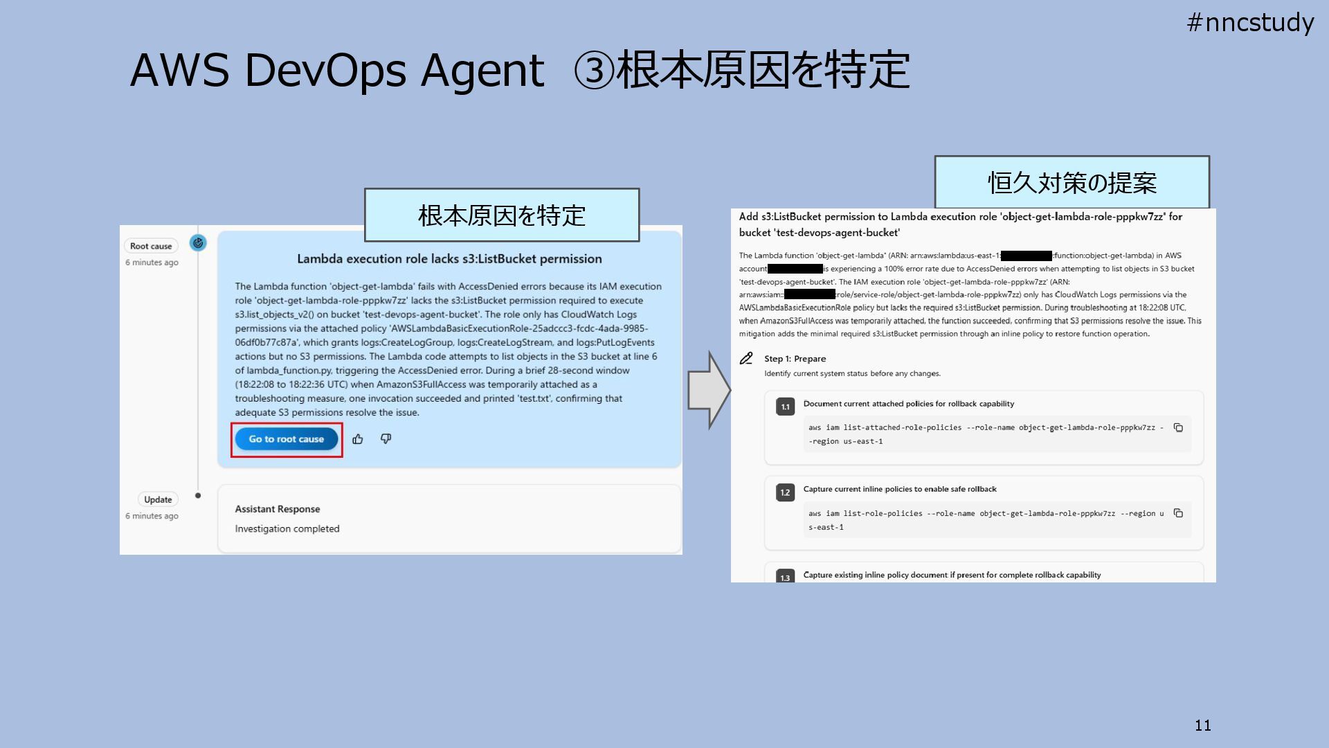 AWS DevOps Agent ③根本原因を特定 11 根本原因を特定 恒久対策の提案 #nncstudy