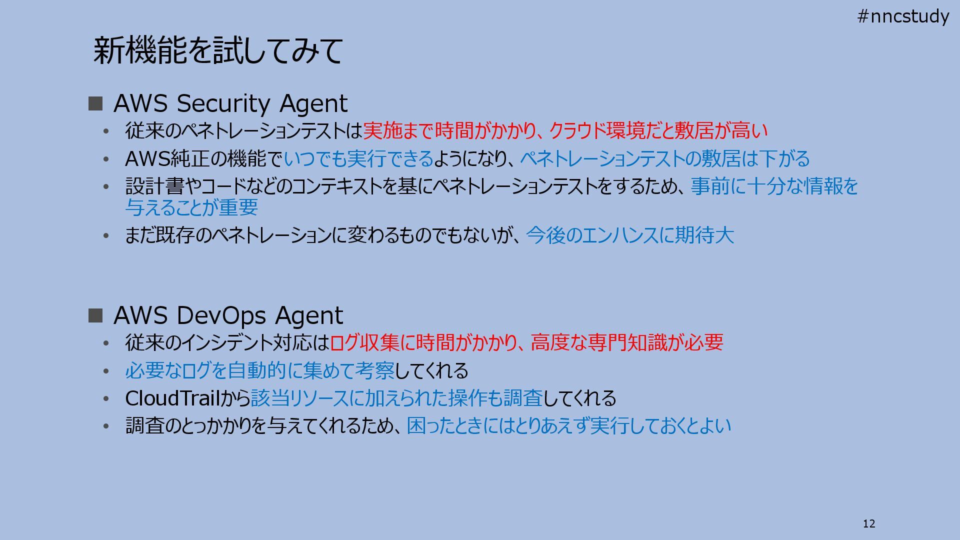 設計書やコードなどのコンテキストを基にペネトレーションテストをするため、事前に十分な情報を 与えることが重要 • まだ既存のペネトレーションに変わるものでもないが、今後のエンハンスに期待大 ◼ AWS DevOps Agent • 従来のインシデント対応はログ収集に時間がかかり、高度な専門知識が必要 • 必要なログを自動的に集めて考察してくれる • CloudTrailから該当リソースに加えられた操作も調査してくれる • 調査のとっかかりを与えてくれるため、困ったときにはとりあえず実行しておくとよい 12 #nncstudy