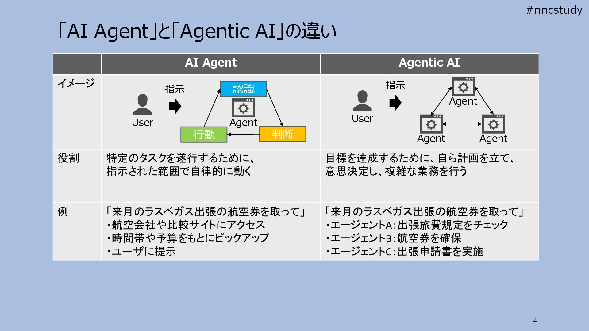 指示された範囲で自律的に動く 目標を達成するために、自ら計画を立て、 意思決定し、複雑な業務を行う 例 「来月のラスベガス出張の航空券を取って」 ・航空会社や比較サイトにアクセス ・時間帯や予算をもとにピックアップ ・ユーザに提示 「来月のラスベガス出張の航空券を取って」 ・エージェントA:出張旅費規定をチェック ・エージェントB:航空券を確保 ・エージェントC:出張申請書を実施 4 認識 判断 行動 指示 Agent User Agent Agent Agent 指示 User #nncstudy