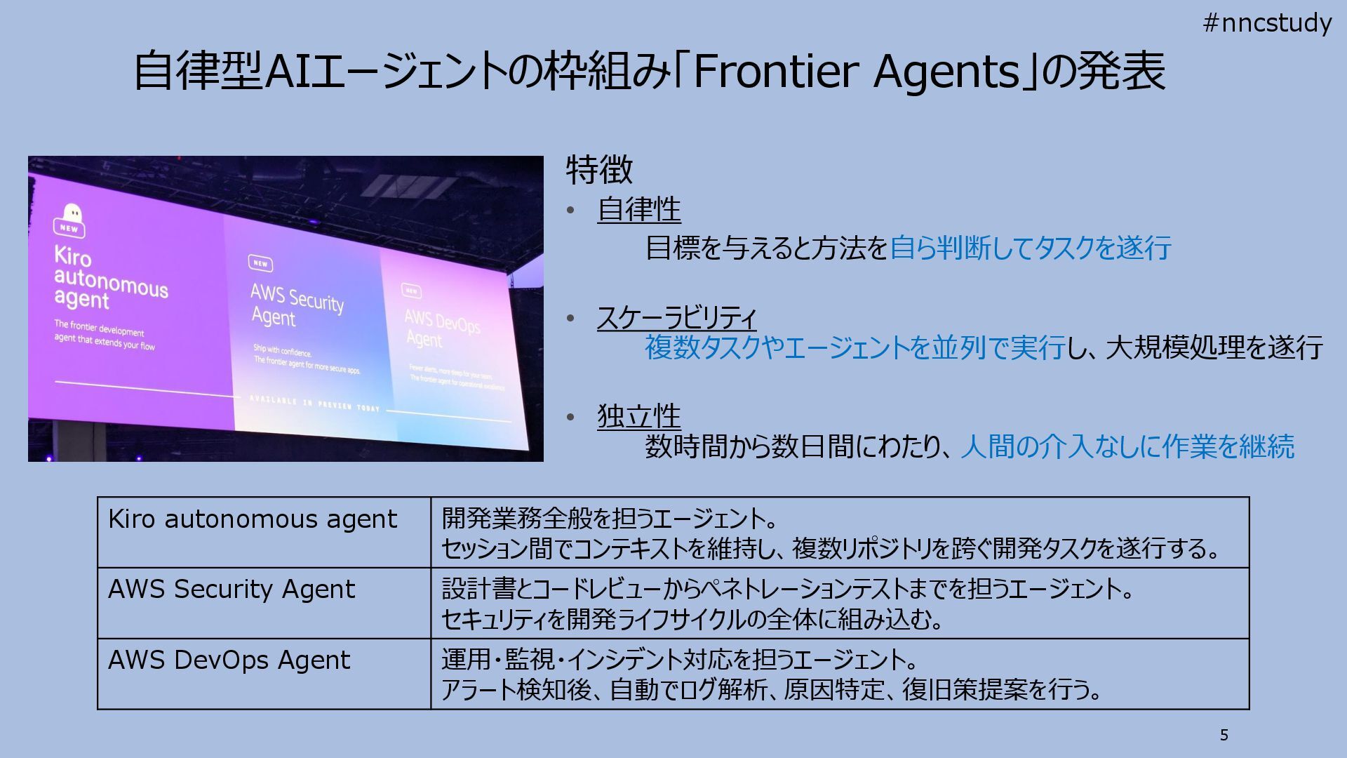設計書とコードレビューからペネトレーションテストまでを担うエージェント。 セキュリティを開発ライフサイクルの全体に組み込む。 AWS DevOps Agent 運用・監視・インシデント対応を担うエージェント。 アラート検知後、自動でログ解析、原因特定、復旧策提案を行う。 5 特徴 • 自律性 目標を与えると方法を自ら判断してタスクを遂行 • スケーラビリティ 複数タスクやエージェントを並列で実行し、大規模処理を遂行 • 独立性 数時間から数日間にわたり、人間の介入なしに作業を継続 #nncstudy