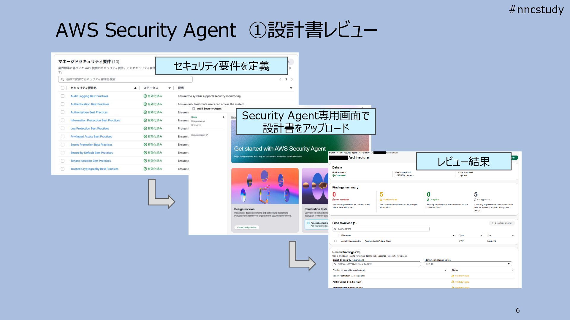 AWS Security Agent ①設計書レビュー 6 セキュリティ要件を定義 Security Agent専用画面で 設計書をアップロード レビュー結果