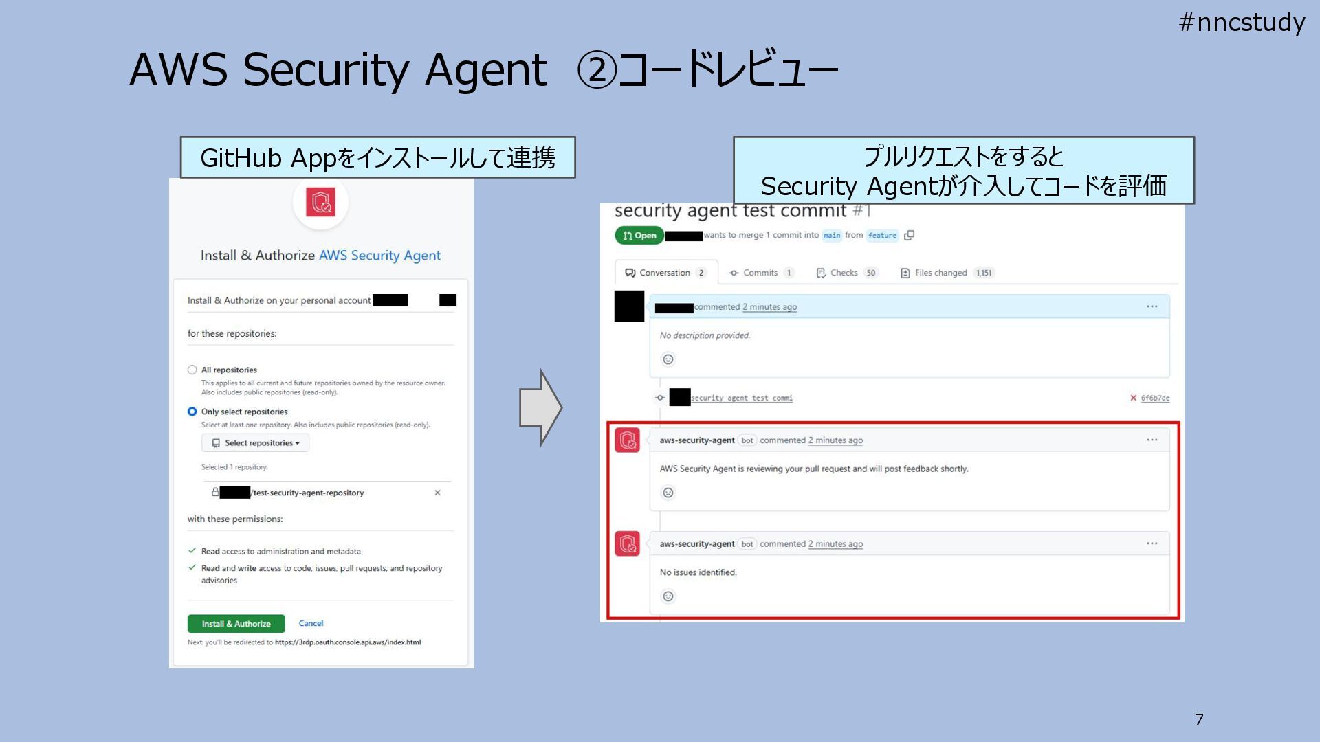 AWS Security Agent ②コードレビュー 7 GitHub Appをインストールして連携 プルリクエストをすると Security Agentが介入してコードを評価