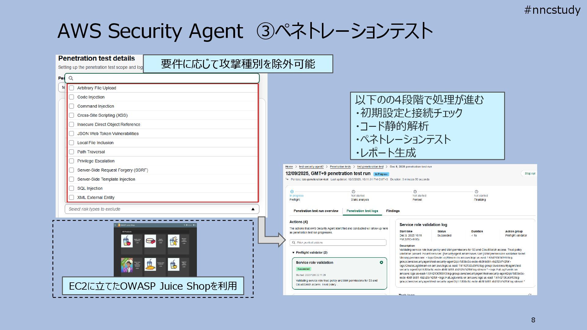 AWS Security Agent ③ペネトレーションテスト 8 要件に応じて攻撃種別を除外可能 以下のの4段階で処理が進む ・初期設定と接続チェック ・コード静的解析 ・ペネトレーションテスト