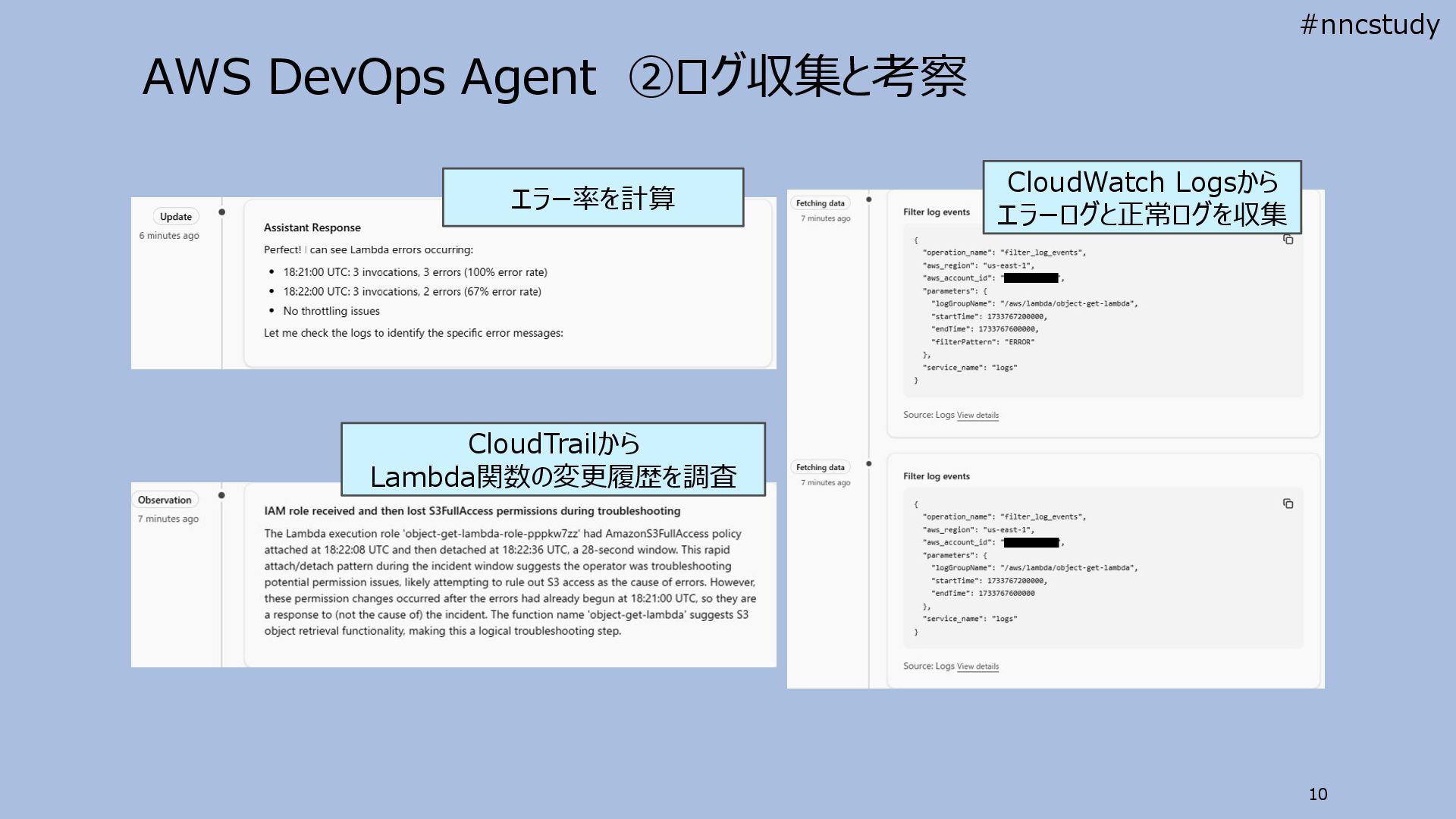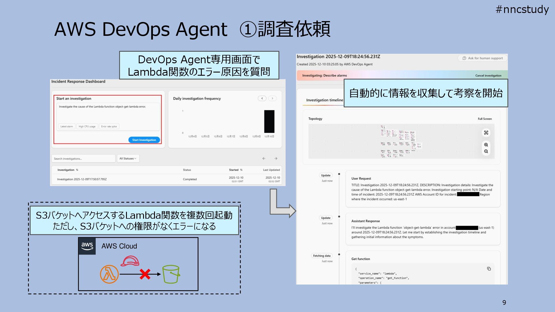 S3バケットへアクセスするLambda関数を複数回起動 ただし、S3バケットへの権限がなくエラーになる 自動的に情報を収集して考察を開始 #nncstudy