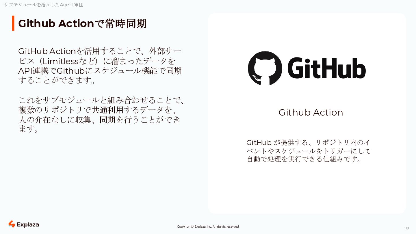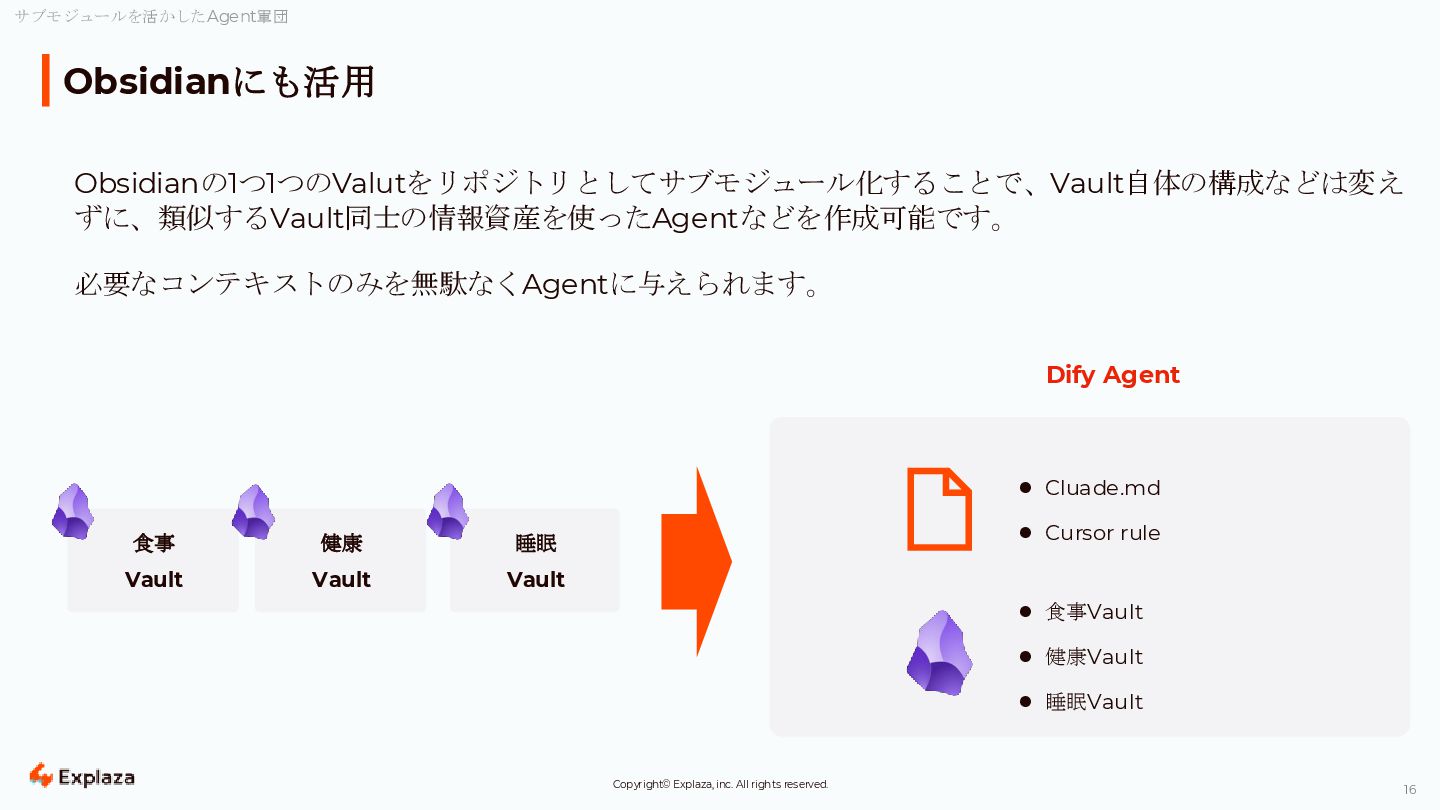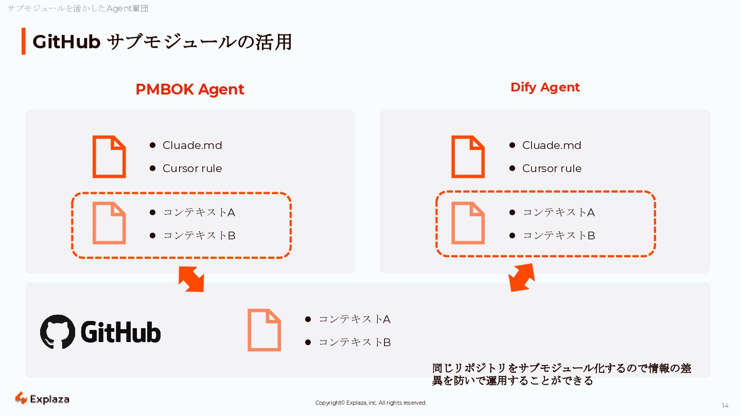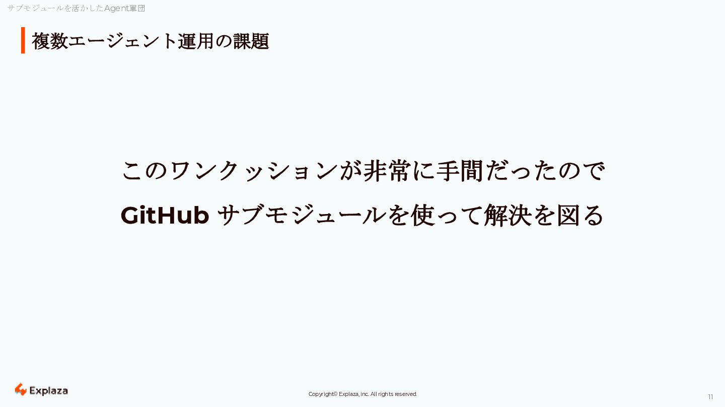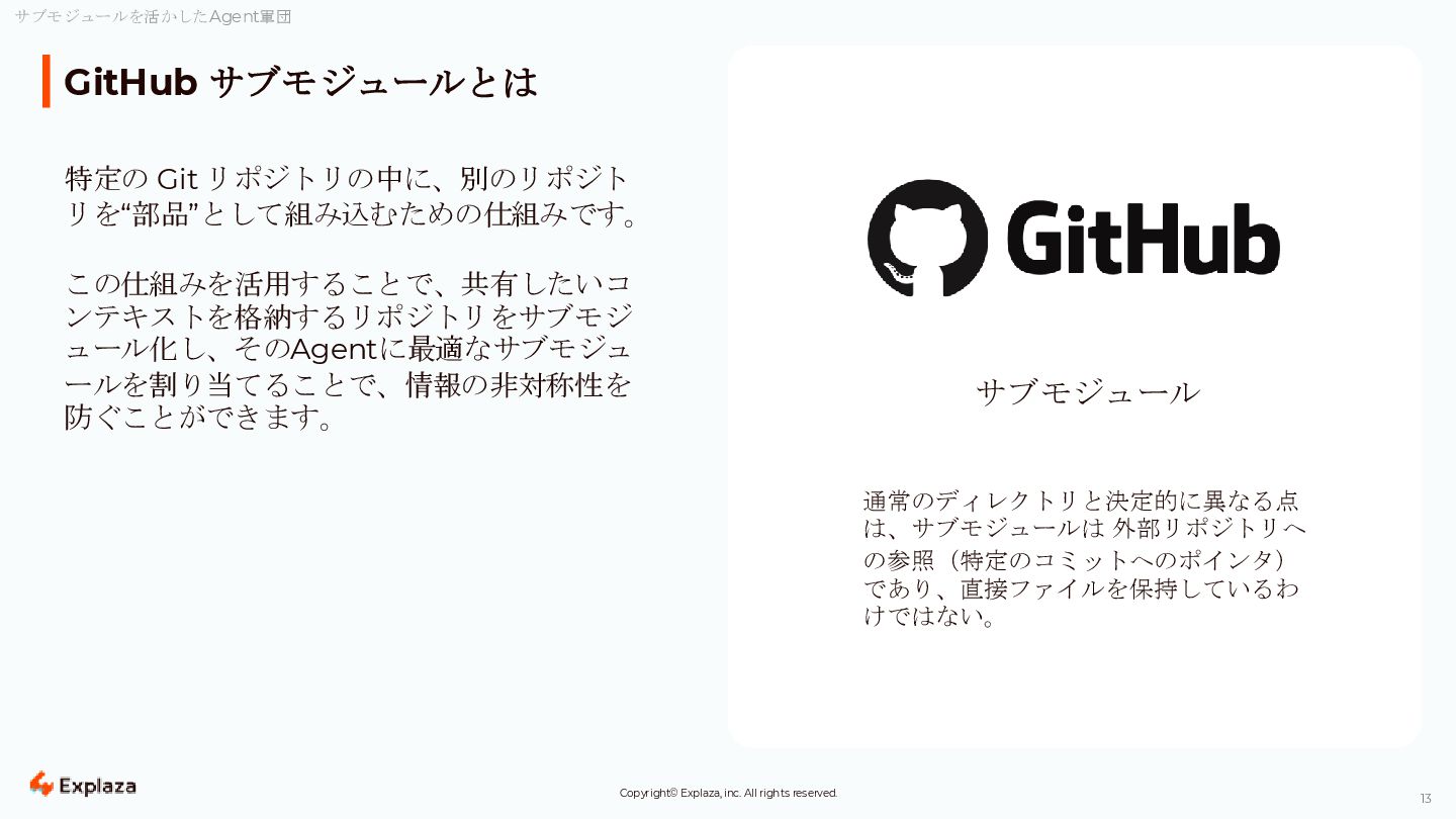 Git リポジトリの中に、別のリポジト リを“部品”として組み込むための仕組みです。 この仕組みを活用することで、共有したいコ ンテキストを格納するリポジトリをサブモジ ュール化し、そのAgentに最適なサブモジュ ールを割り当てることで、情報の非対称性を 防ぐことができます。 サブモジュール 通常のディレクトリと決定的に異なる点 は、サブモジュールは 外部リポジトリへ の参照(特定のコミットへのポインタ) であり、直接ファイルを保持しているわ けではない。 サブモジュールを活かしたAgent軍団