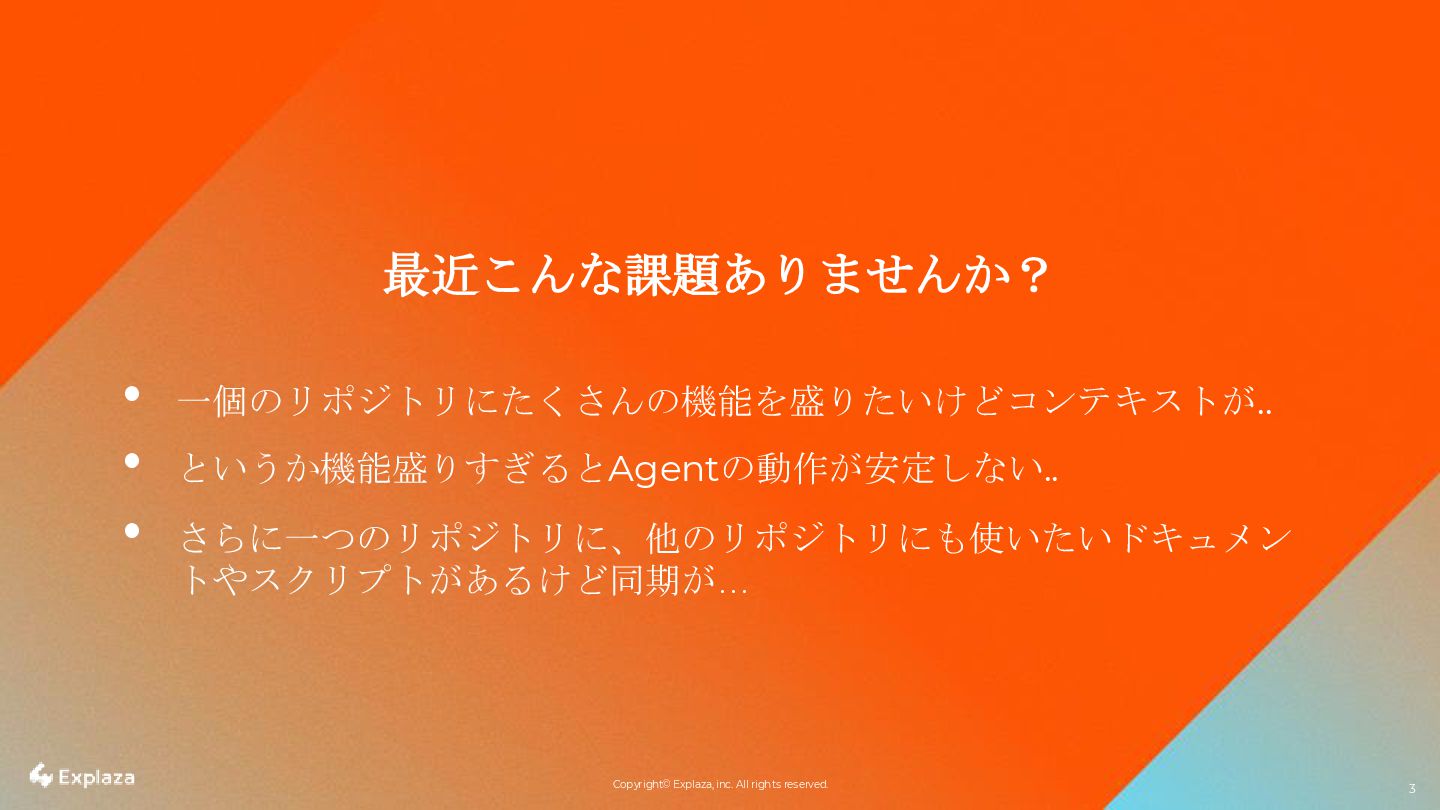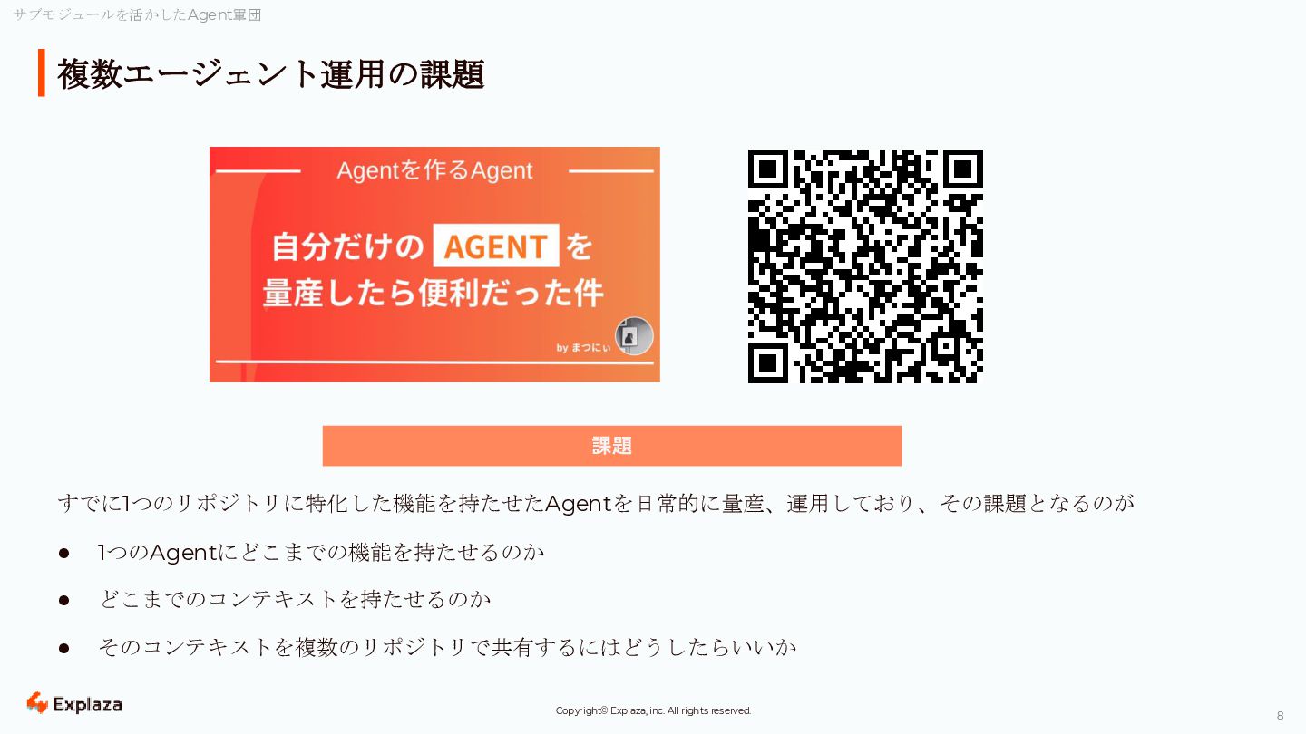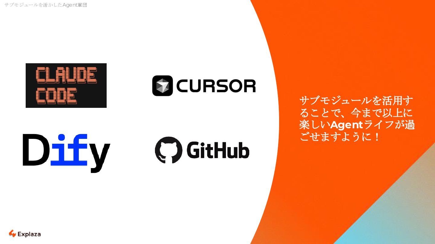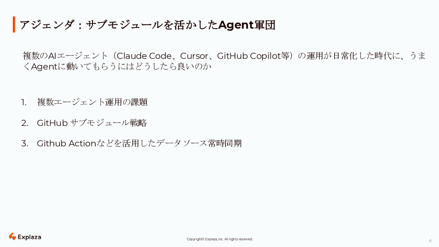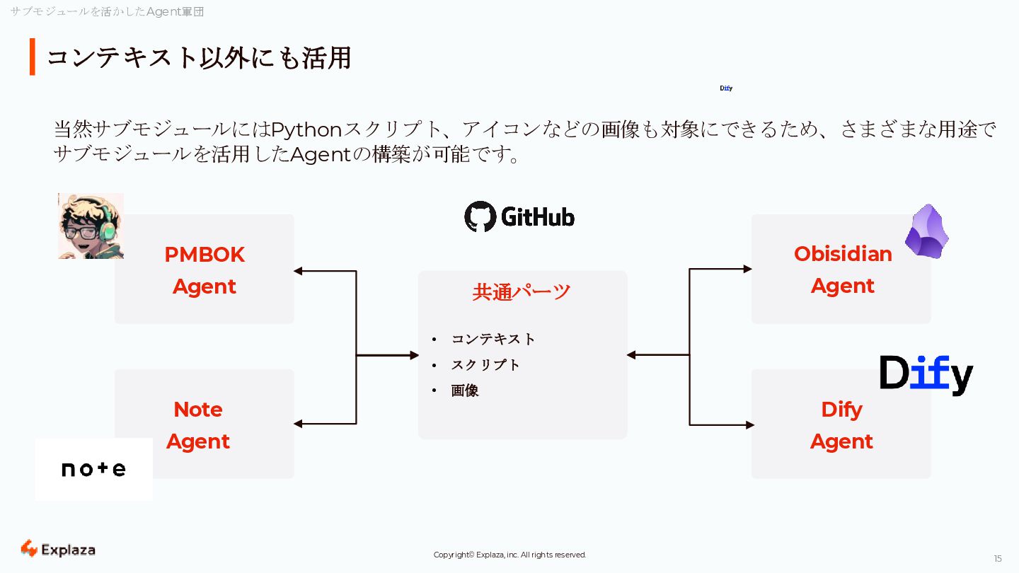 Git リポジトリの中に、別のリポジト リを“部品”として組み込むための仕組みです。 この仕組みを活用することで、共有したいコ ンテキストを格納するリポジトリをサブモジ ュール化し、そのAgentに最適なサブモジュ ールを割り当てることで、情報の非対称性を 防ぐことができます。 サブモジュール 通常のディレクトリと決定的に異なる点 は、サブモジュールは 外部リポジトリへ の参照(特定のコミットへのポインタ) であり、直接ファイルを保持しているわ けではない。 サブモジュールを活かしたAgent軍団