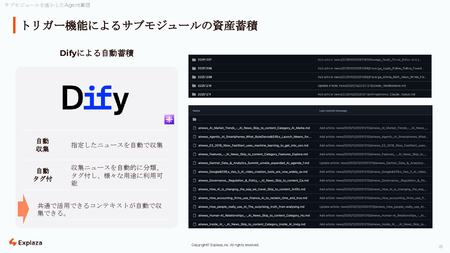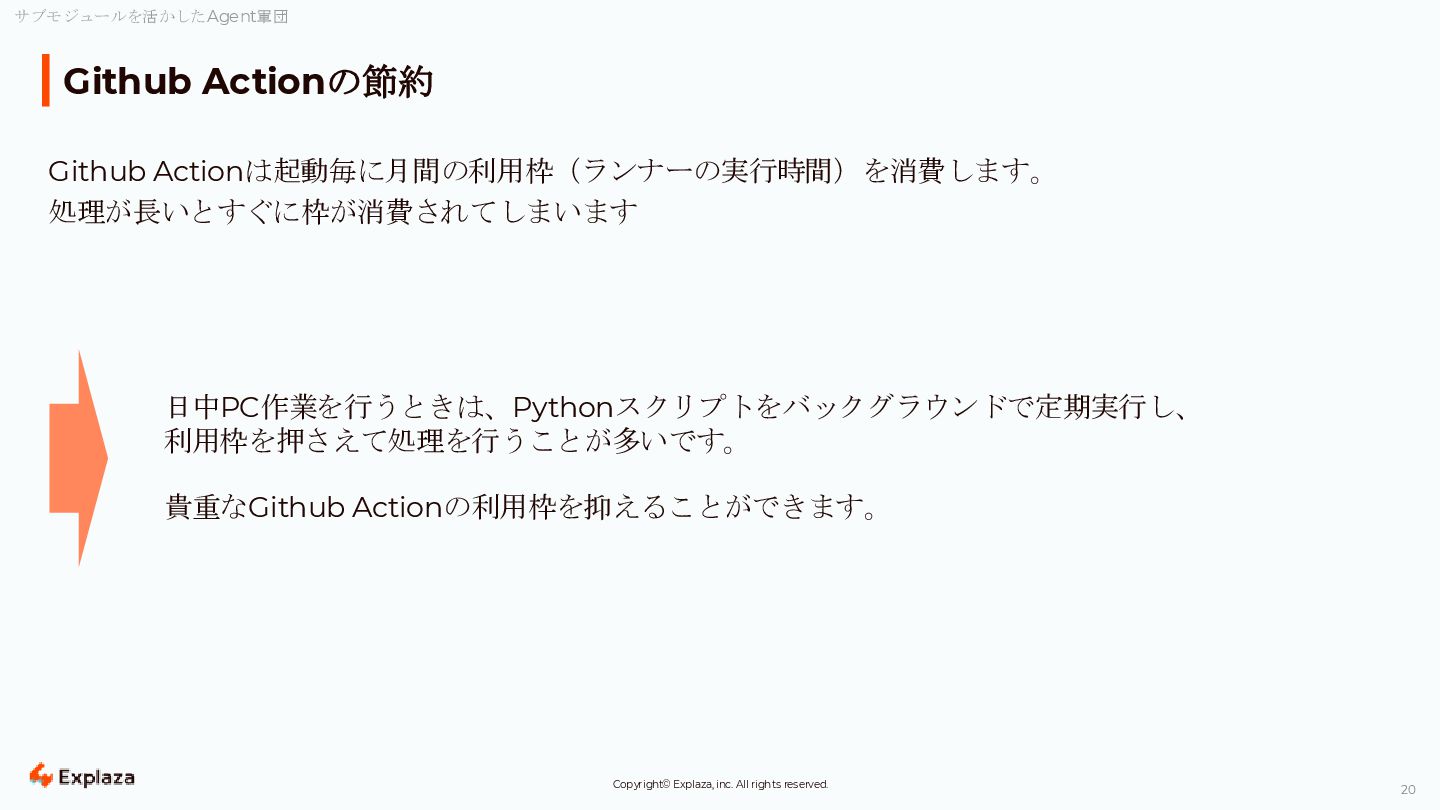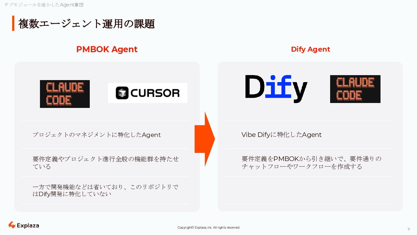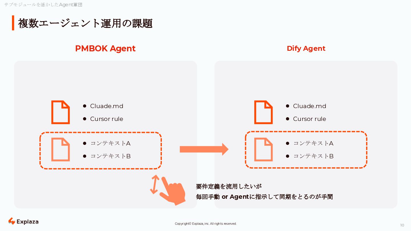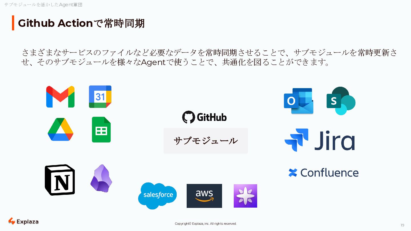 Git リポジトリの中に、別のリポジト リを“部品”として組み込むための仕組みです。 この仕組みを活用することで、共有したいコ ンテキストを格納するリポジトリをサブモジ ュール化し、そのAgentに最適なサブモジュ ールを割り当てることで、情報の非対称性を 防ぐことができます。 サブモジュール 通常のディレクトリと決定的に異なる点 は、サブモジュールは 外部リポジトリへ の参照(特定のコミットへのポインタ) であり、直接ファイルを保持しているわ けではない。 サブモジュールを活かしたAgent軍団