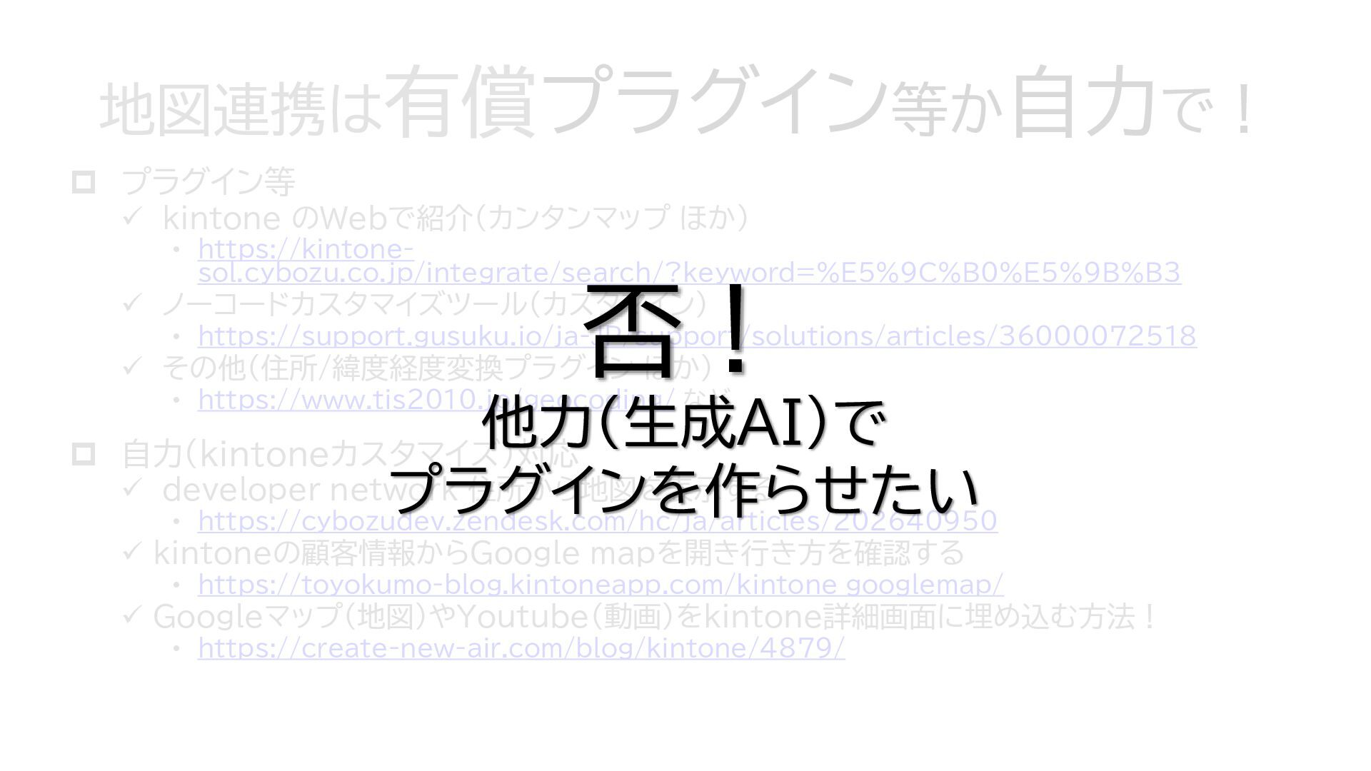 GPSマルチユニットでkintoneに保管した緯度、経度情報は地図で確認したいところ。 これまではkintoneに地図を表示するにはプラグインかカスタマイズが必要でした。 そこで今回、生成AIのみで地図を表示するプラグインを作れないか試してみました。