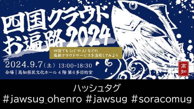 主催 四国クラウドお遍路実行委員会 (JAWS-UG徳島、JAWS-UG高知、JAWS-UG愛媛、JAWS-UGうどん県) 共催 SORACOM UG 四国