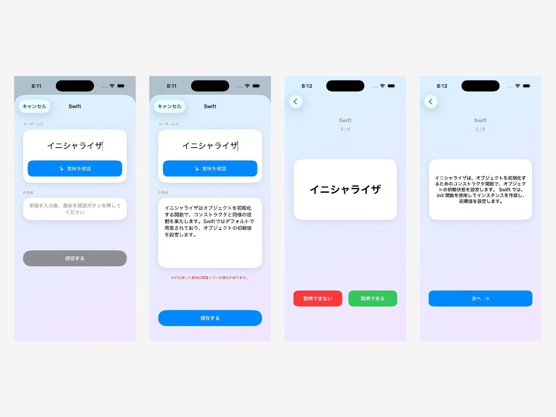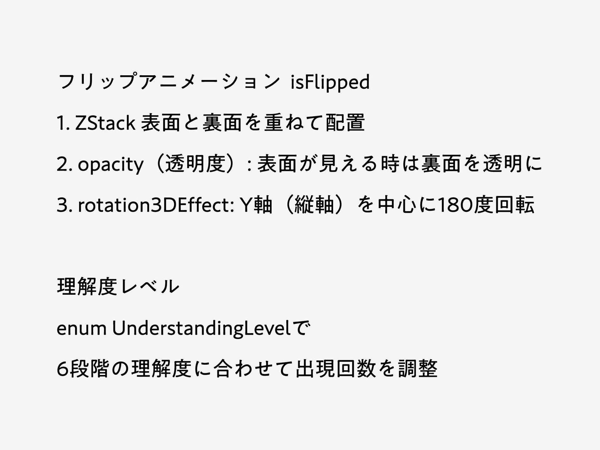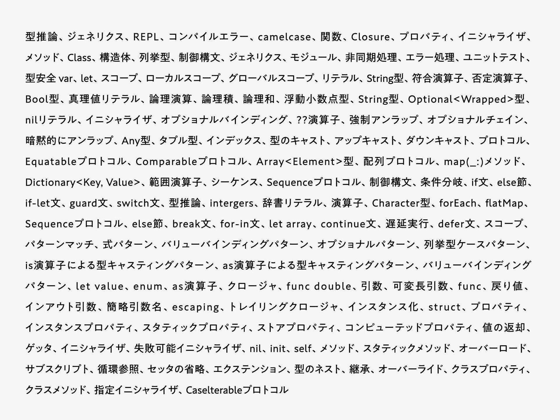 if-let文、guard文、switch文、型推論、intergers、辞書リテラル、演算子、Character型、forEach、flatMap、 Sequenceプロトコル、else節、break文、for-in文、let array、continue文、遅延実行、defer文、スコープ、 パターンマッチ、式パターン、バリューバインディングパターン、オプショナルパターン、列挙型ケースパターン、 is演算子による型キャスティングパターン、as演算子による型キャスティングパターン、バリューバインディング パターン、let value、enum、as演算子、クロージャ、func double、引数、可変長引数、func、戻り値、 インアウト引数、簡略引数名、escaping、トレイリングクロージャ、インスタンス化、struct、プロパティ、 インスタンスプロパティ、スタティックプロパティ、ストアプロパティ、コンピューテッドプロパティ、値の返却、 ゲッタ、イニシャライザ、失敗可能イニシャライザ、nil、init、self、メソッド、スタティックメソッド、オーバーロード、 サブスクリプト、循環参照、セッタの省略、エクステンション、型のネスト、継承、オーバーライド、クラスプロパティ、 クラスメソッド、指定イニシャライザ、Caselterableプロトコル