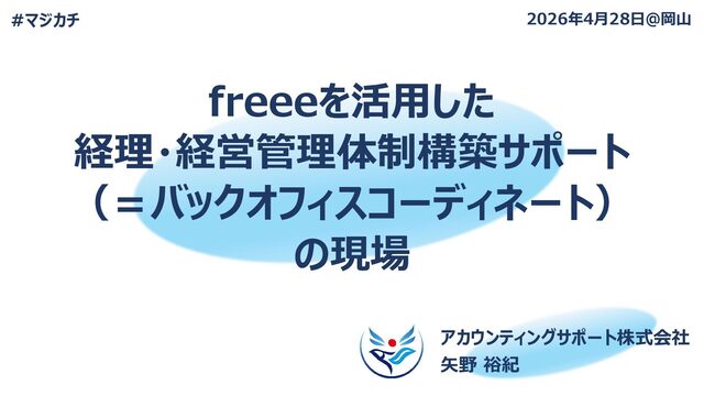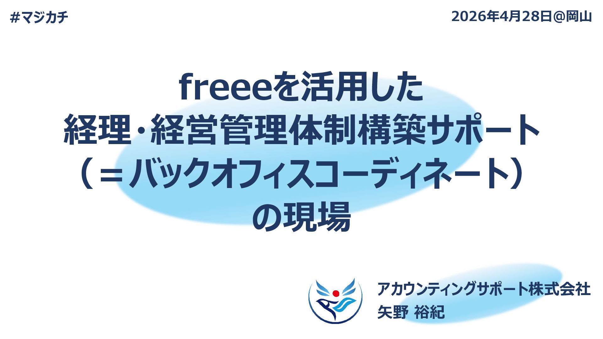 freeeを活用した 経理・経営管理体制構築サポート (=バックオフィスコーディネート) の現場 アカウンティングサポート株式会社 矢野 裕紀 #マジカチ 2026年4月28日@岡山
