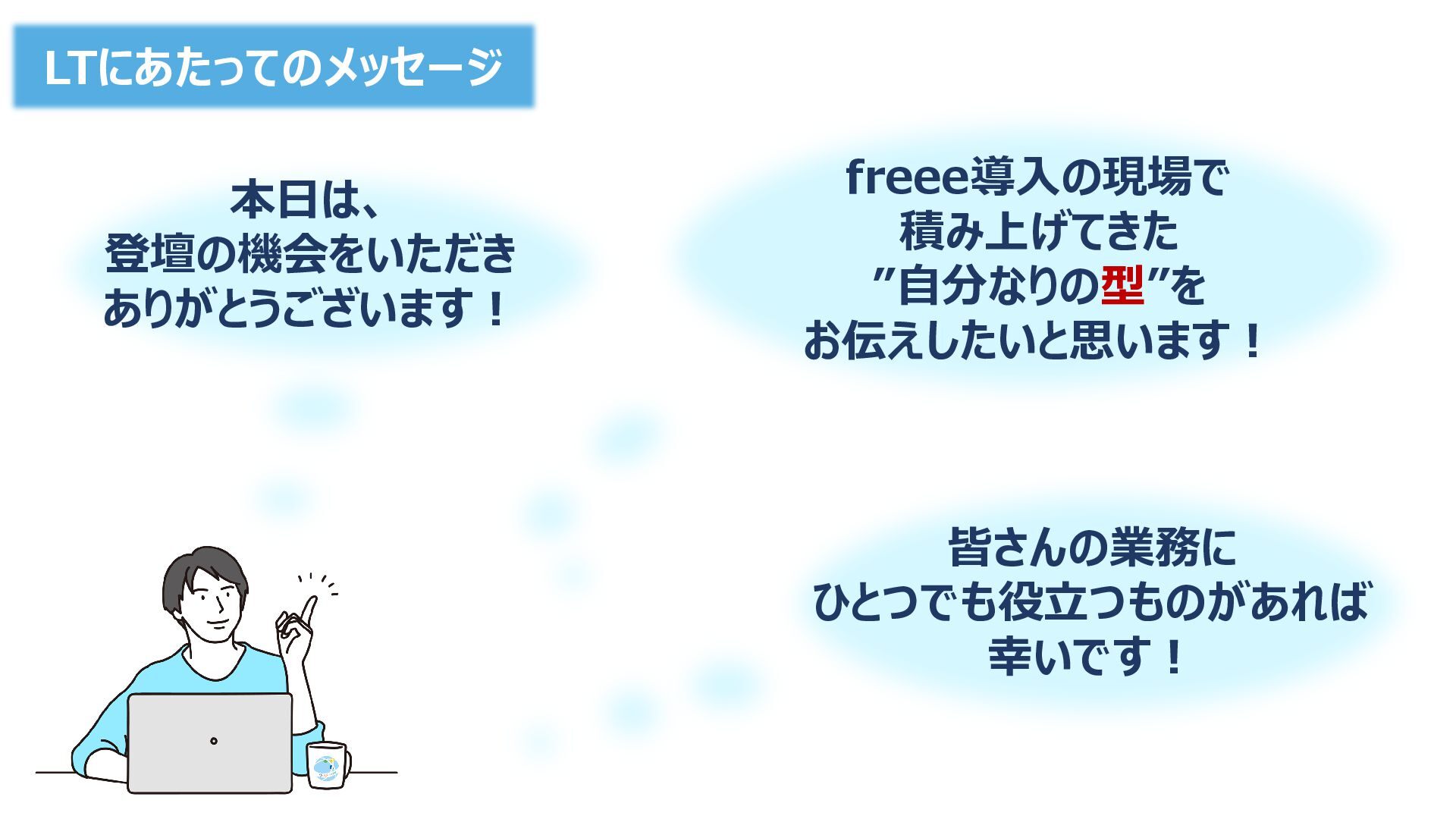 LTにあたってのメッセージ 本日は、 登壇の機会をいただき ありがとうございます! freee導入の現場で 積み上げてきた ”自分なりの型”を お伝えしたいと思います! 皆さんの業務に ひとつでも役立つものがあれば