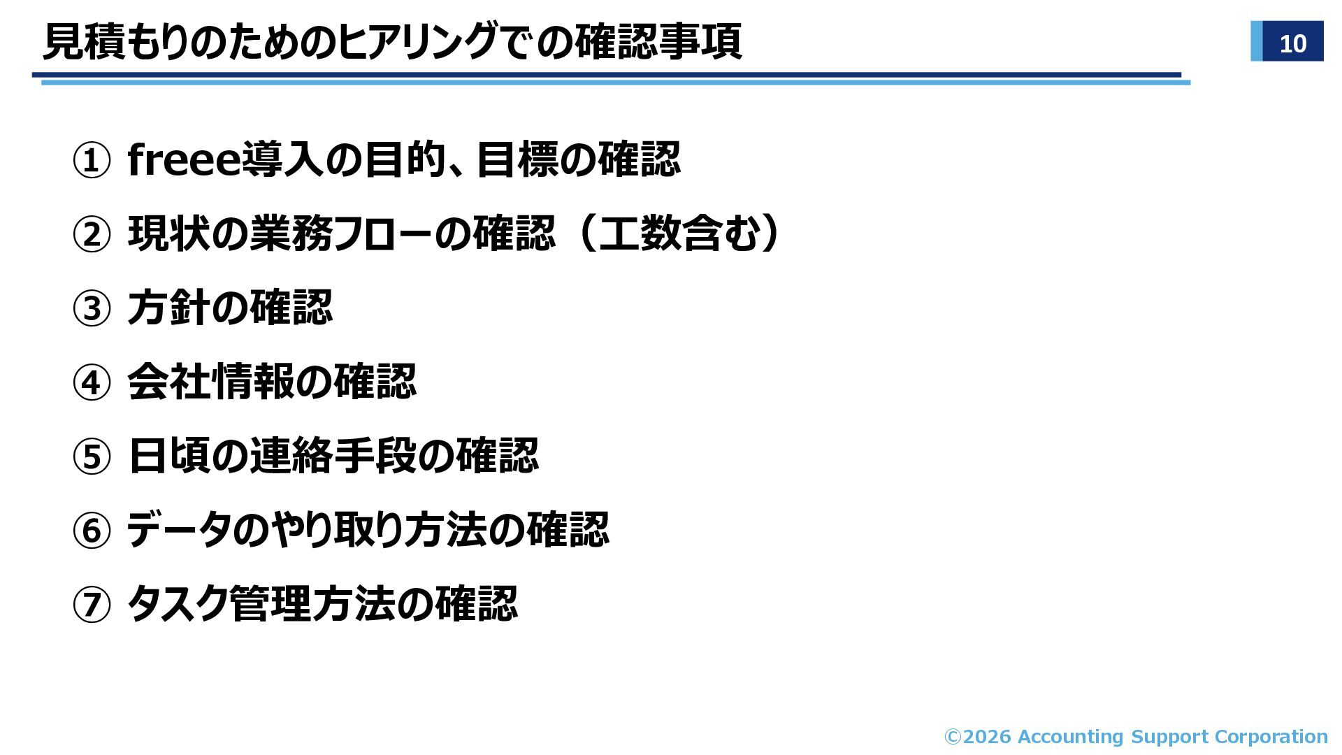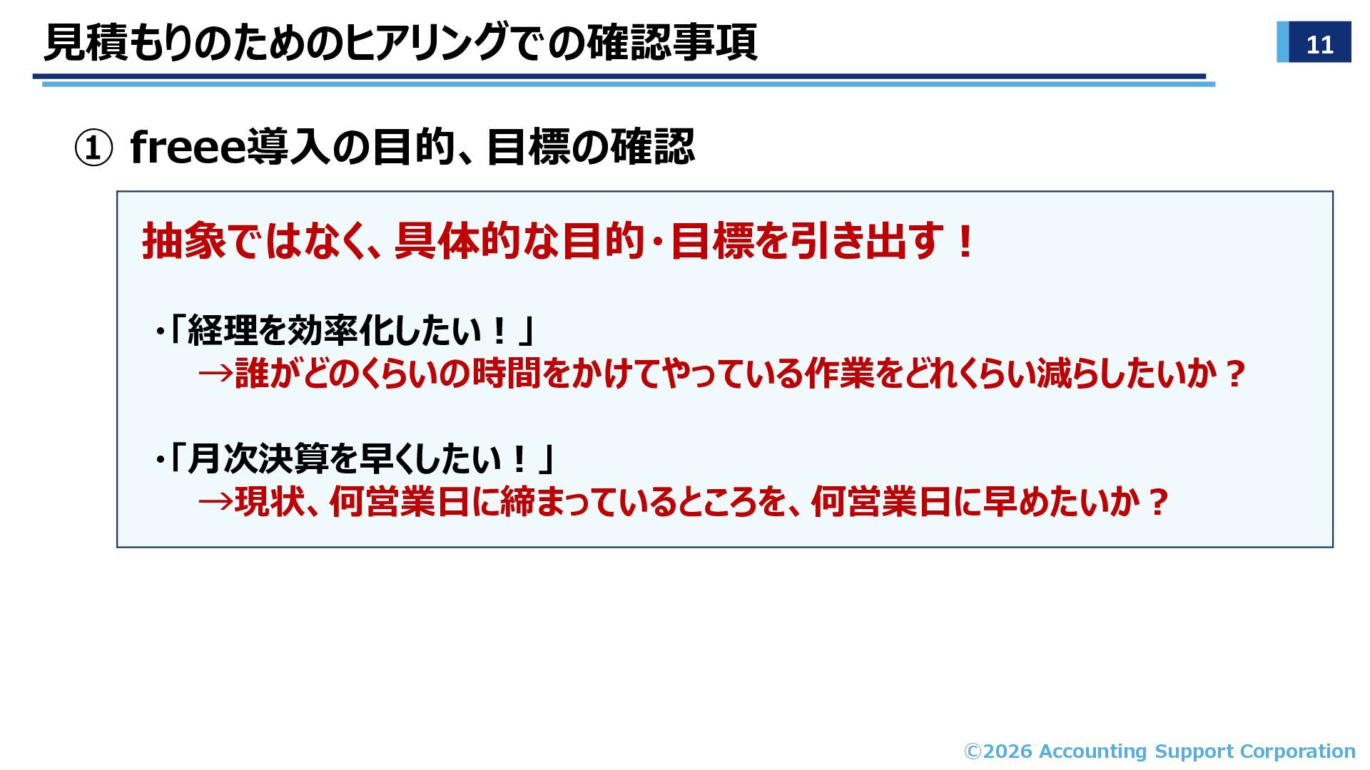 10 Ⓒ2026 Accounting Support Corporation 見積もりのためのヒアリングでの確認事項 ① freee導入の目的、目標の確認 ② 現状の業務フローの確認(工数含む)