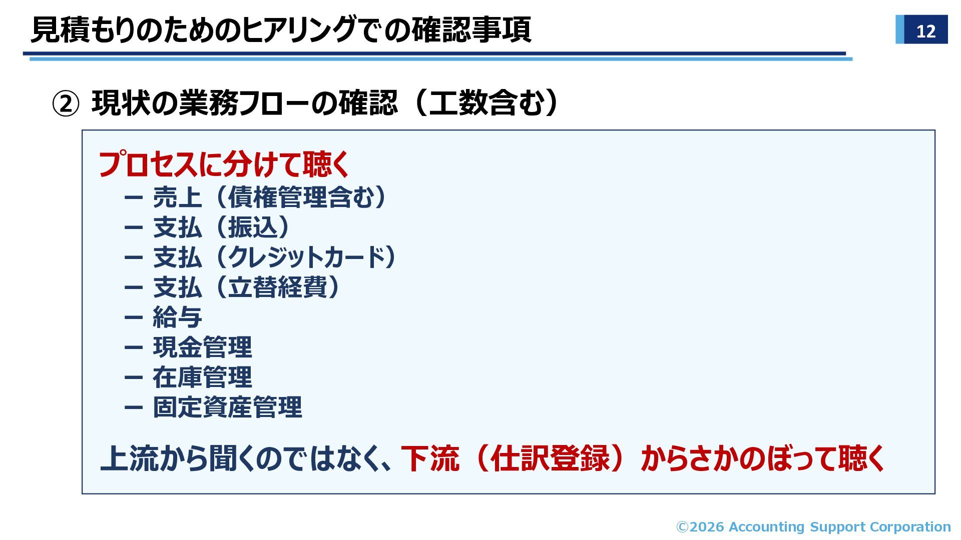 11 Ⓒ2026 Accounting Support Corporation 見積もりのためのヒアリングでの確認事項 ① freee導入の目的、目標の確認 抽象ではなく、具体的な目的・目標を引き出す! ・「経理を効率化したい!」
