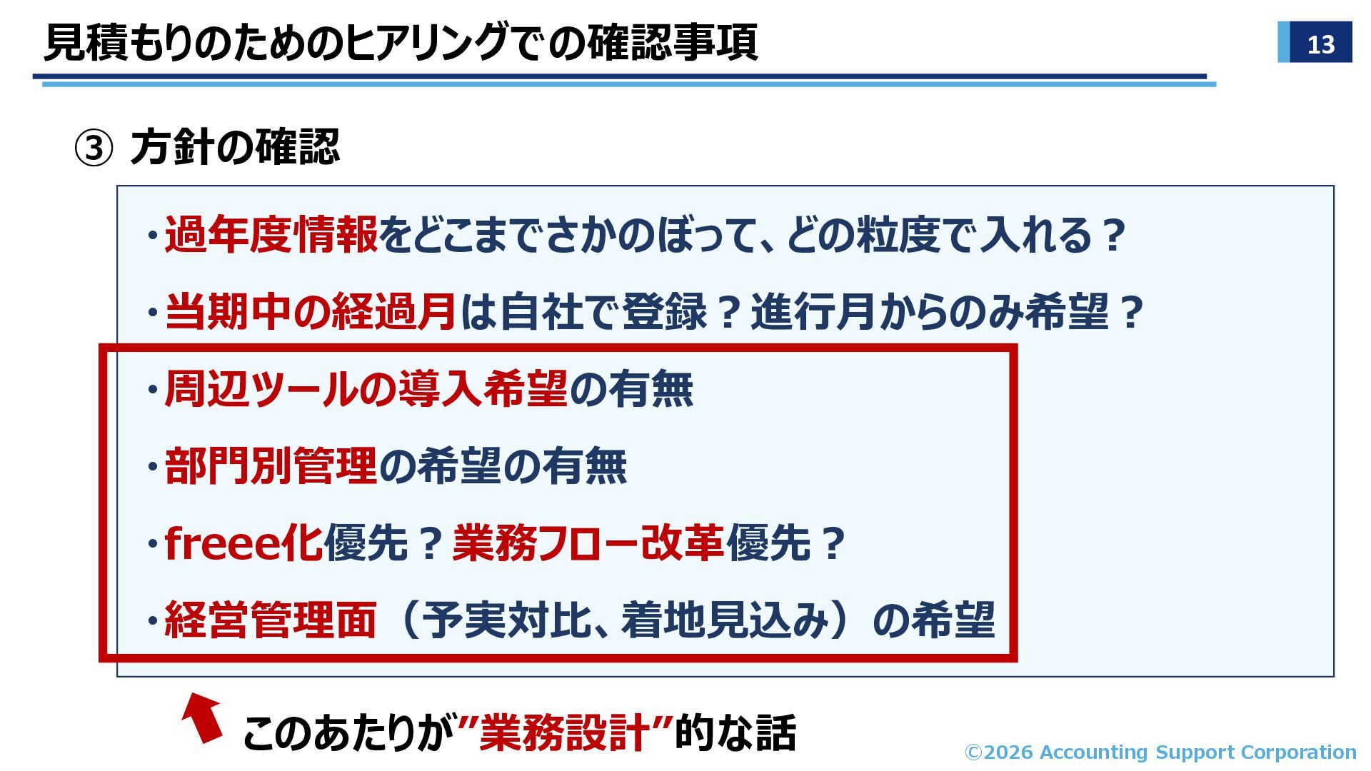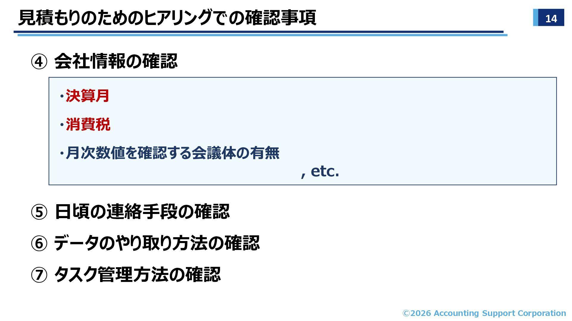 14 Ⓒ2026 Accounting Support Corporation 見積もりのためのヒアリングでの確認事項 ・決算月 ・消費税 ・月次数値を確認する会議体の有無 ,