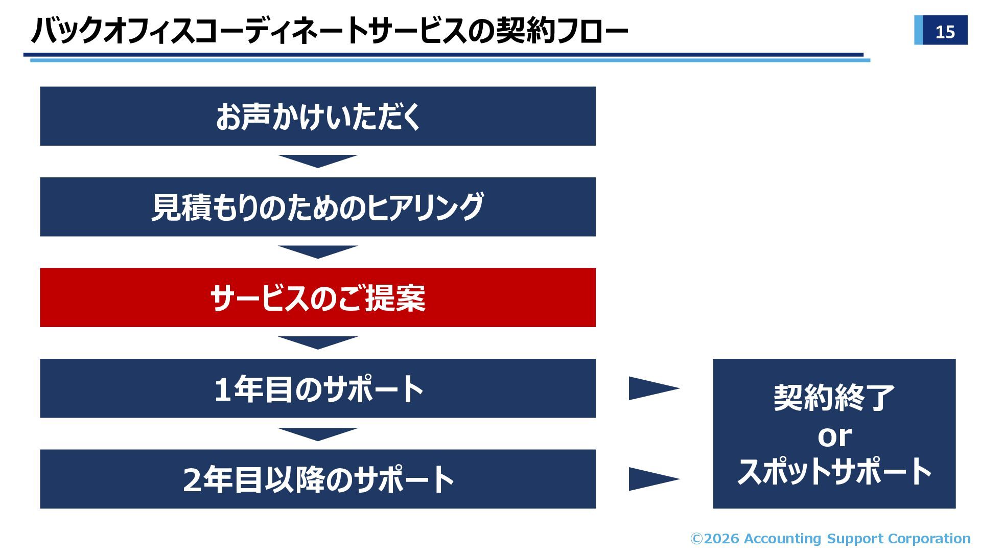 15 Ⓒ2026 Accounting Support Corporation バックオフィスコーディネートサービスの契約フロー お声かけいただく 見積もりのためのヒアリング サービスのご提案 1年目のサポート