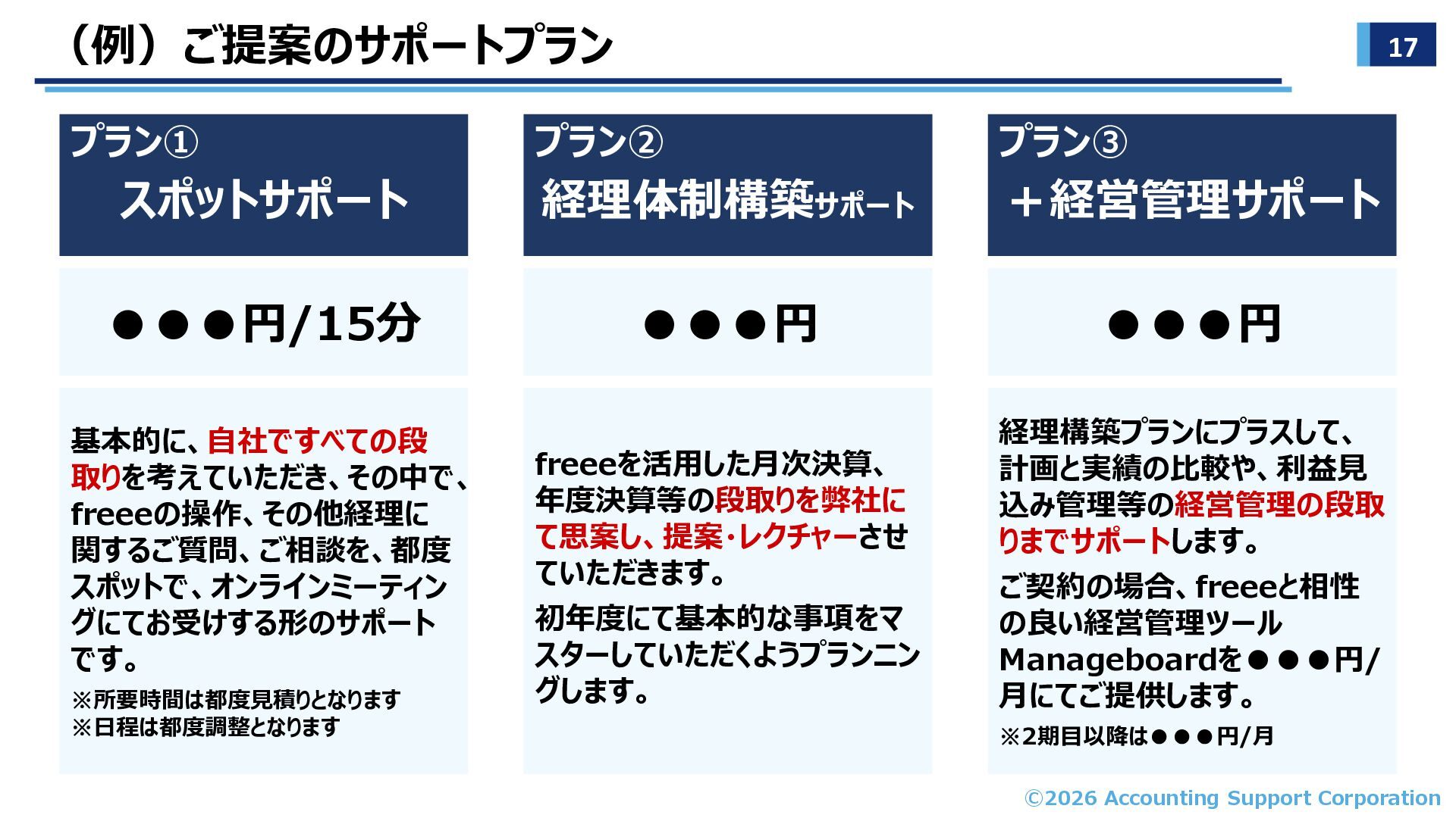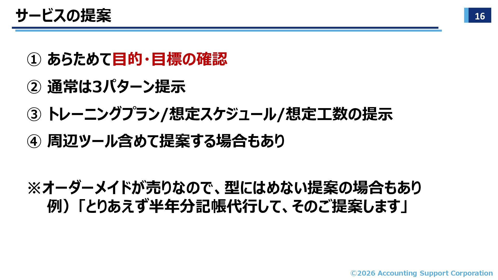 16 Ⓒ2026 Accounting Support Corporation サービスの提案 ① あらためて目的・目標の確認 ② 通常は3パターン提示