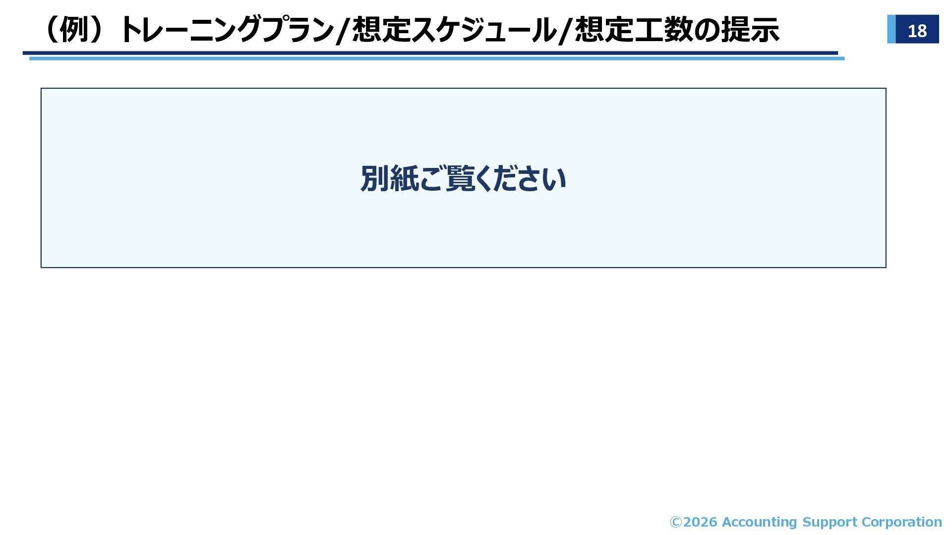 18 Ⓒ2026 Accounting Support Corporation (例)トレーニングプラン/想定スケジュール/想定工数の提示 別紙ご覧ください
