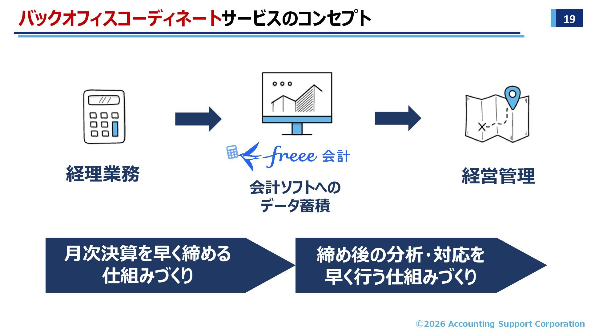 19 Ⓒ2026 Accounting Support Corporation バックオフィスコーディネートサービスのコンセプト 月次決算を早く締める 仕組みづくり 締め後の分析・対応を 早く行う仕組みづくり