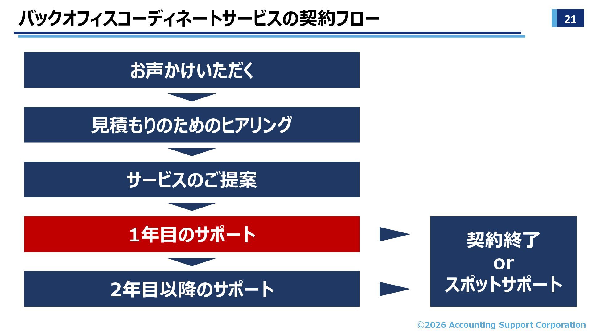 21 Ⓒ2026 Accounting Support Corporation バックオフィスコーディネートサービスの契約フロー お声かけいただく 見積もりのためのヒアリング サービスのご提案 1年目のサポート