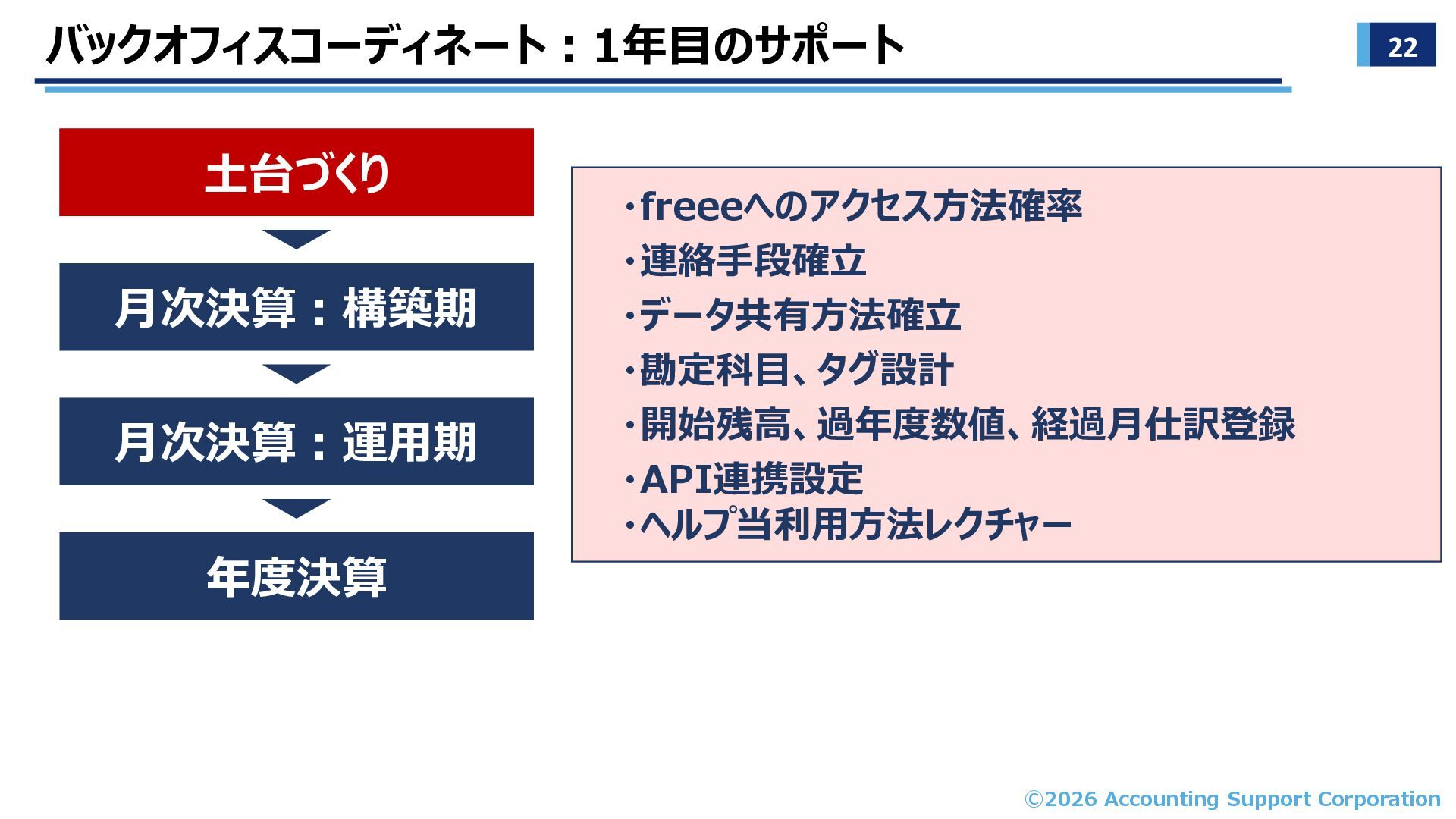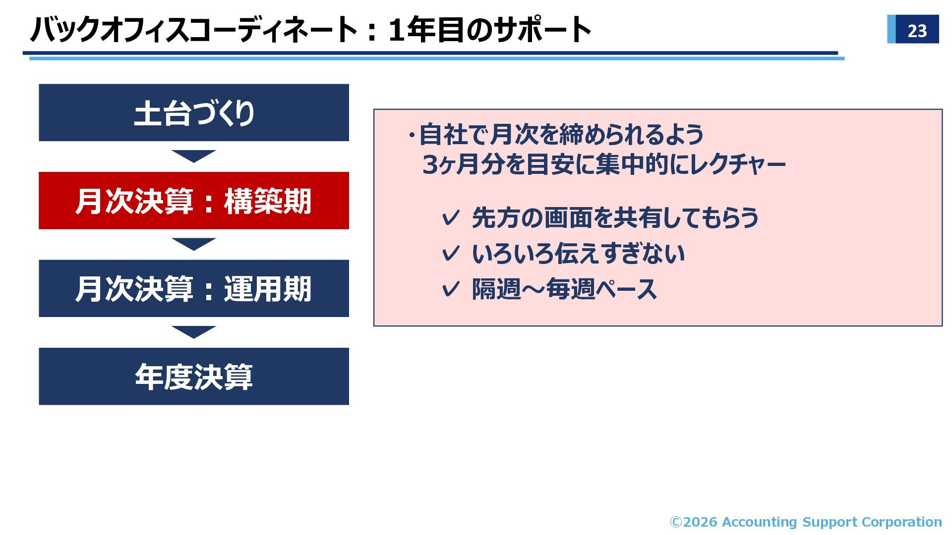 22 Ⓒ2026 Accounting Support Corporation バックオフィスコーディネート:1年目のサポート 土台づくり 月次決算:構築期 月次決算:運用期 年度決算