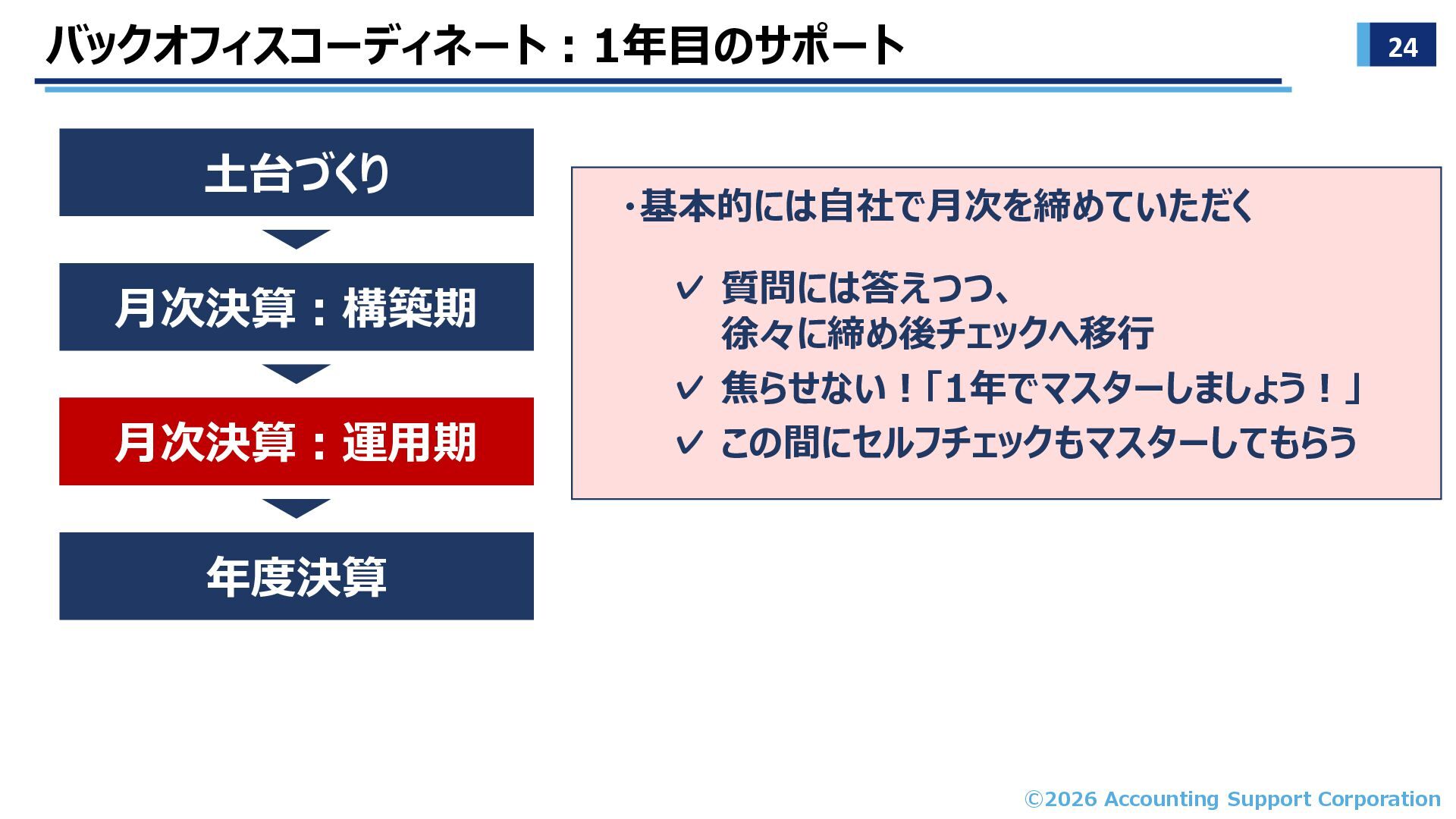 23 Ⓒ2026 Accounting Support Corporation バックオフィスコーディネート:1年目のサポート 土台づくり 月次決算:構築期 月次決算:運用期 年度決算