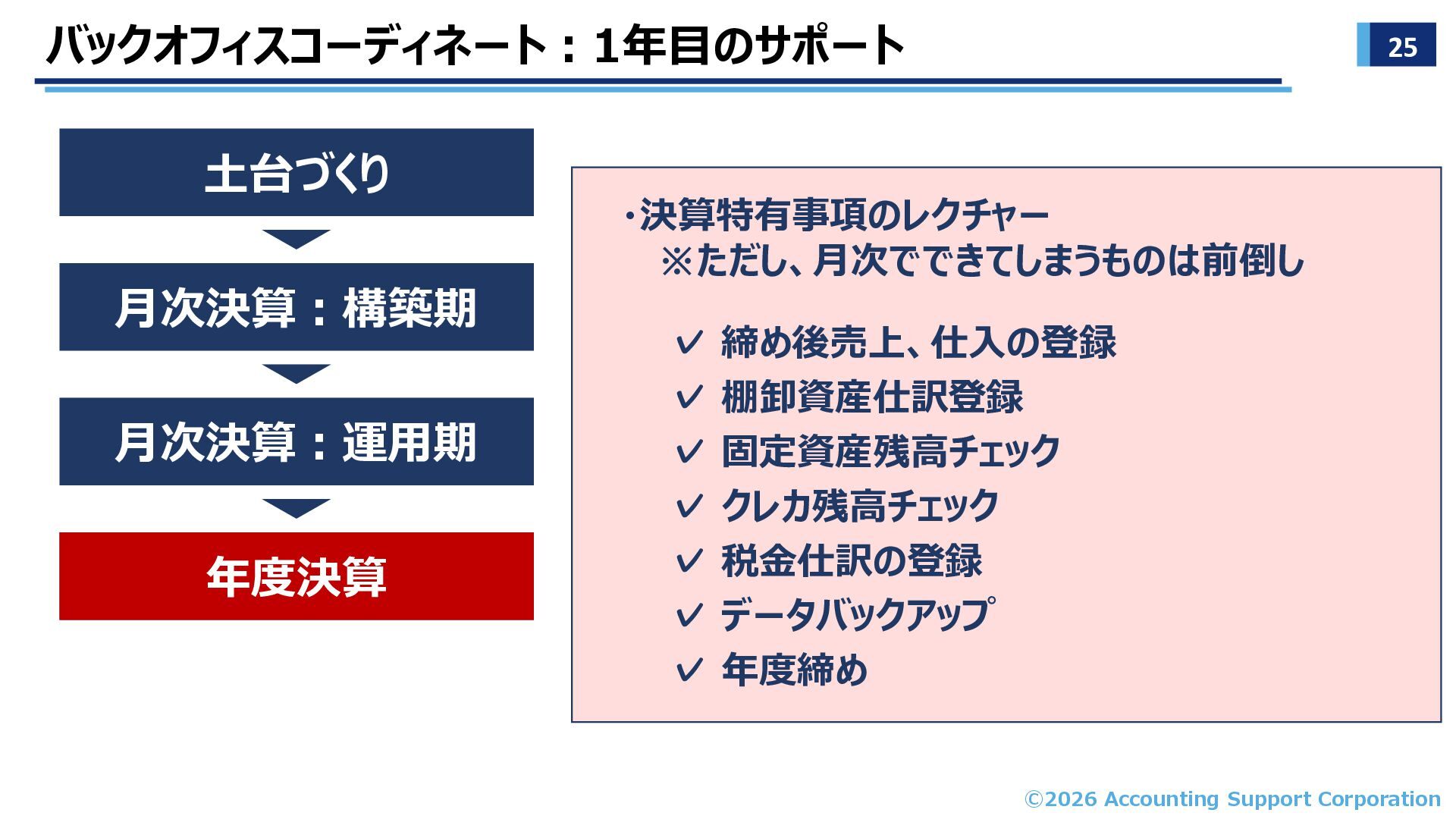 24 Ⓒ2026 Accounting Support Corporation バックオフィスコーディネート:1年目のサポート 土台づくり 月次決算:構築期 月次決算:運用期 年度決算