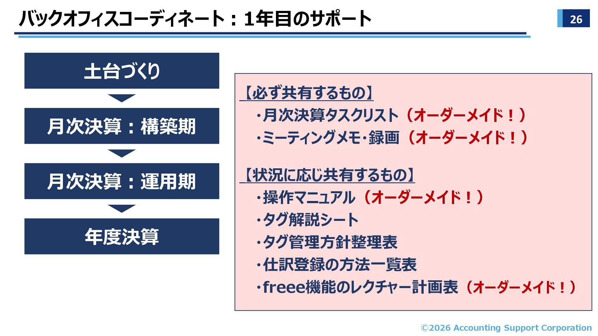 25 Ⓒ2026 Accounting Support Corporation バックオフィスコーディネート:1年目のサポート 土台づくり 月次決算:構築期 月次決算:運用期 年度決算