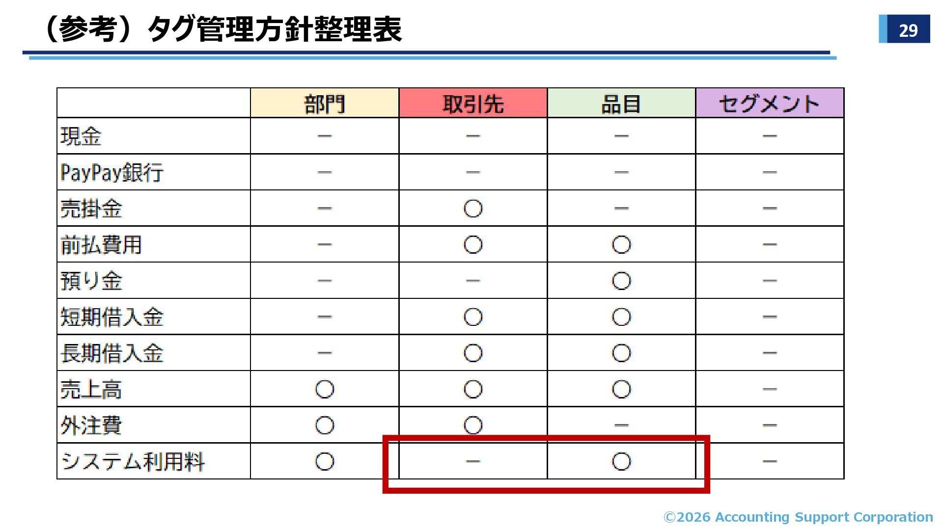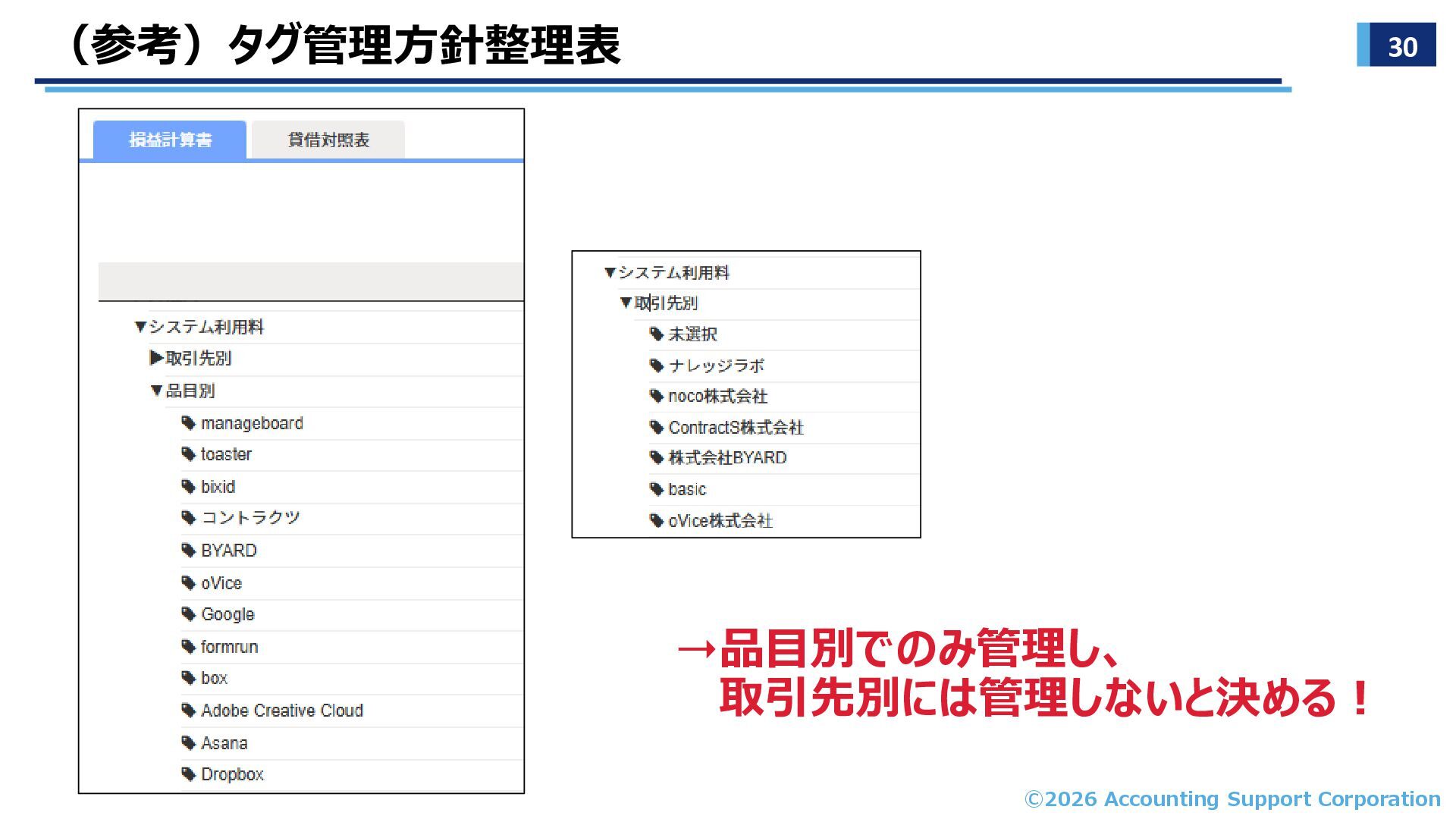 30 Ⓒ2026 Accounting Support Corporation (参考)タグ管理方針整理表 ➝品目別でのみ管理し、 取引先別には管理しないと決める!