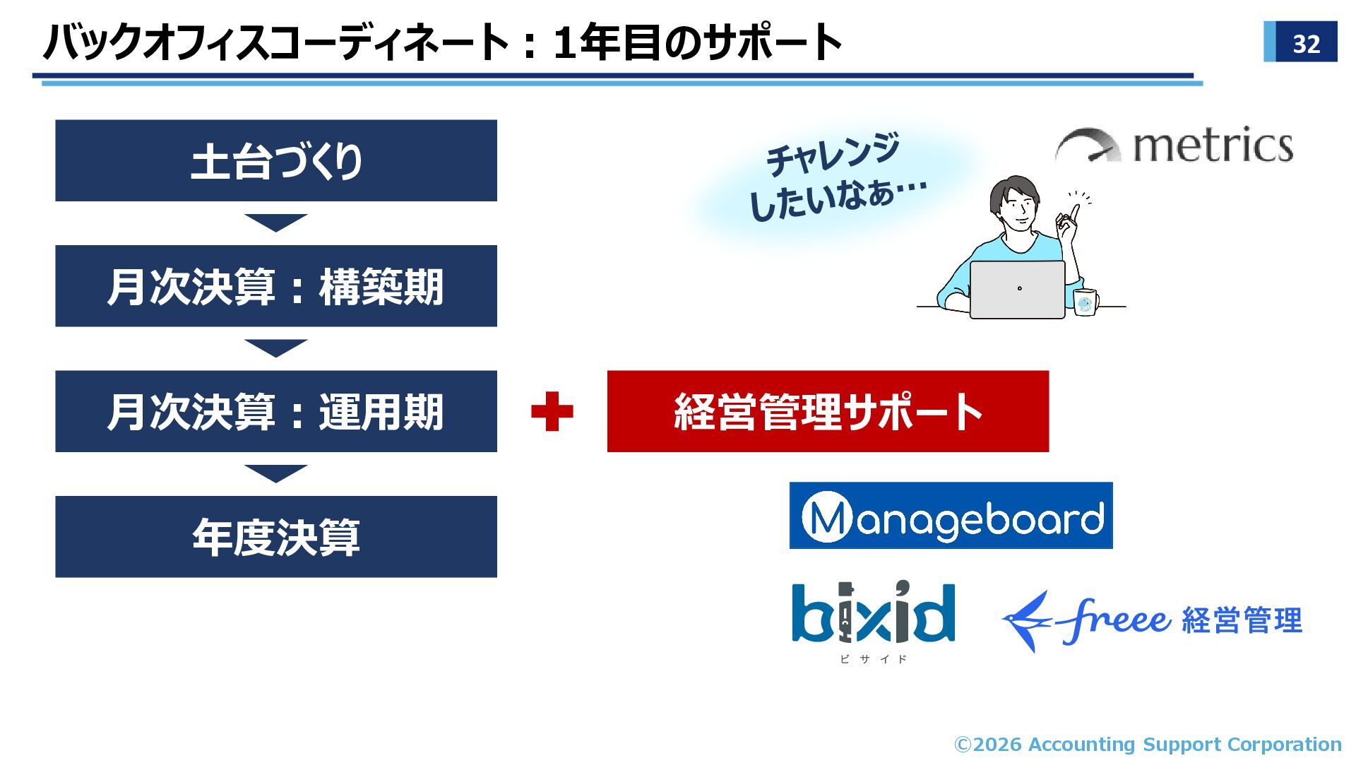 32 Ⓒ2026 Accounting Support Corporation バックオフィスコーディネート:1年目のサポート 土台づくり 月次決算:構築期 月次決算:運用期 年度決算